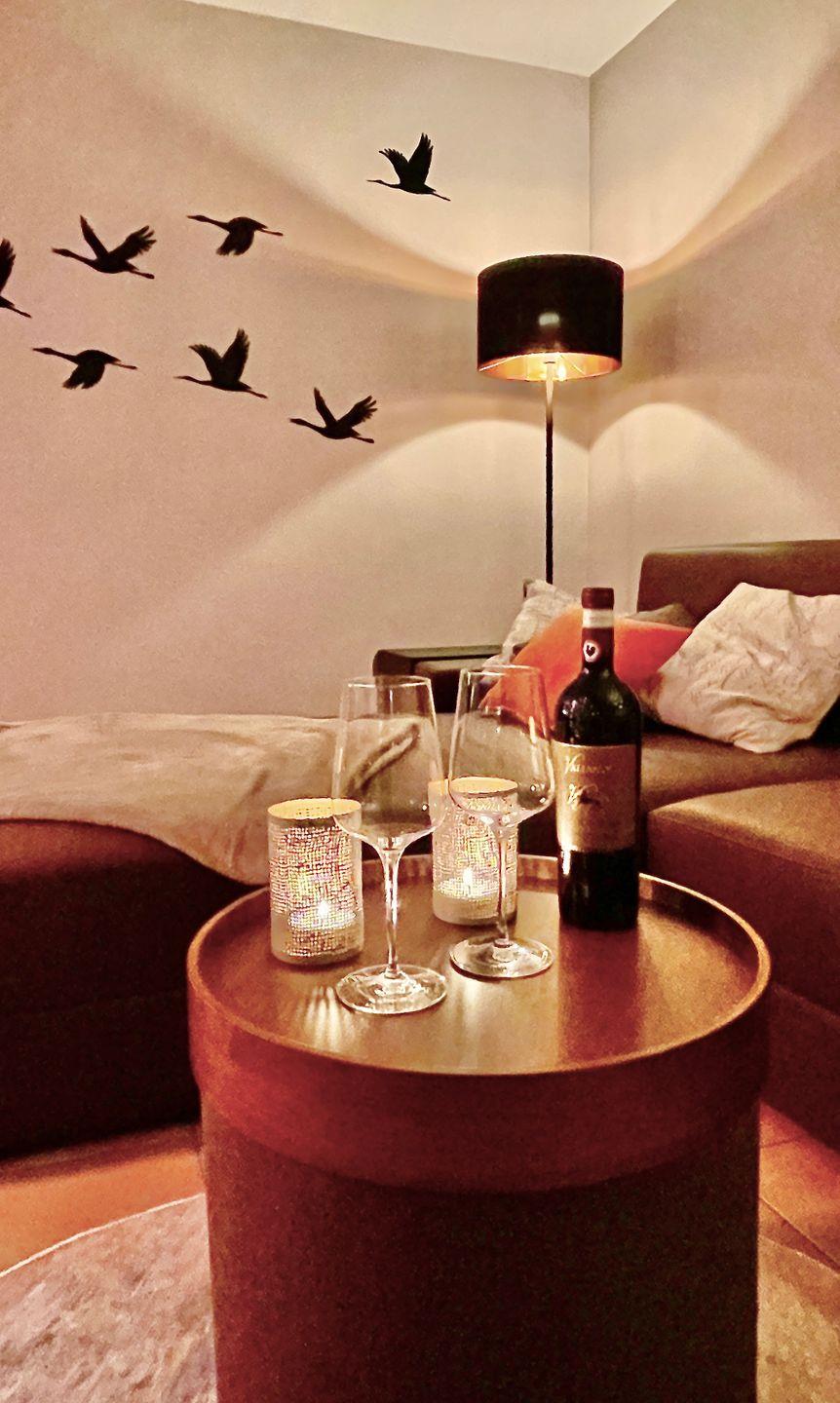 Im Wohnbereich steht eine gemütliche Sofa-Landschaft. Medienentertainment bietet der große Smart-TV und ein Bluetooth-Lautsprecher. W-LAN ist kostenlos über den Hot-Spot-Anschluss (Anmeldung erforderlich).