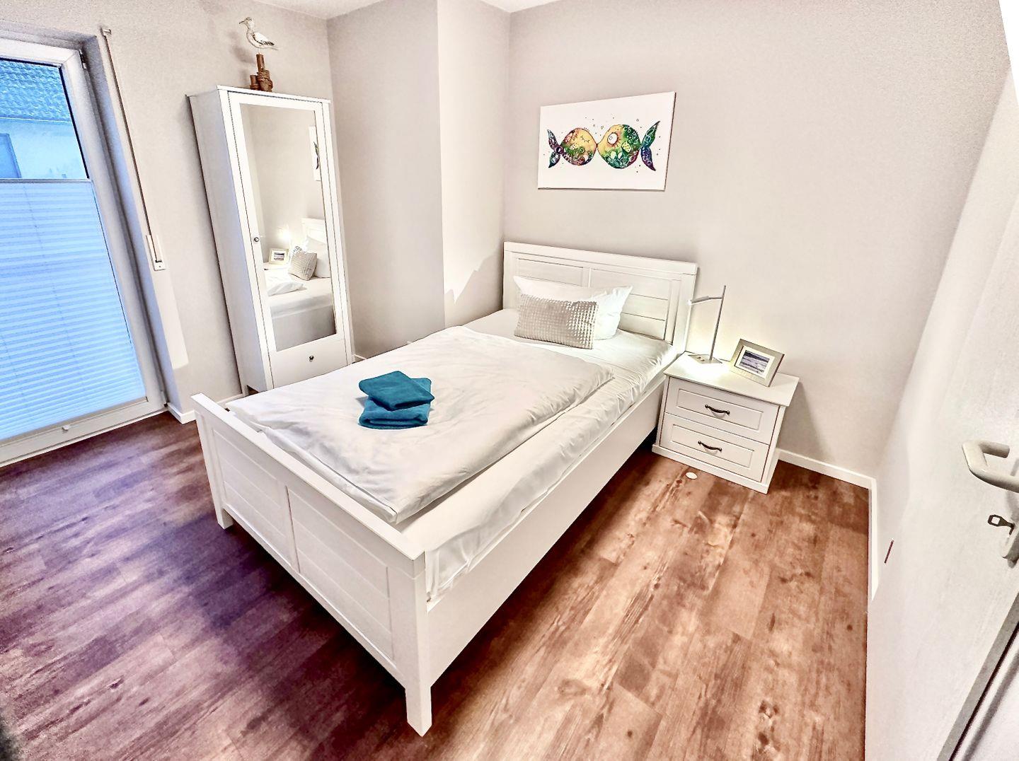 Schlafzimmer 1: Doppelbett (1,80 x 2,00 m) mit verstellbarem Lattenrost. Ein großer Kleiderschrank.