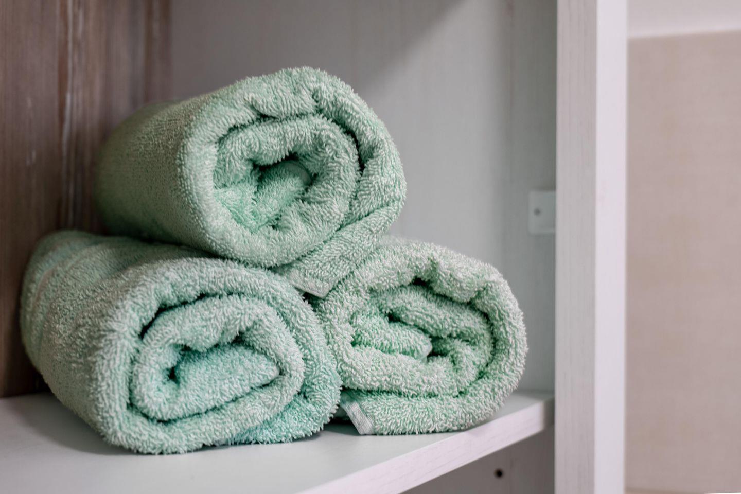 Das Badezimmer verfügt über Ablagemöglichkeiten, eine Dusche und WC.