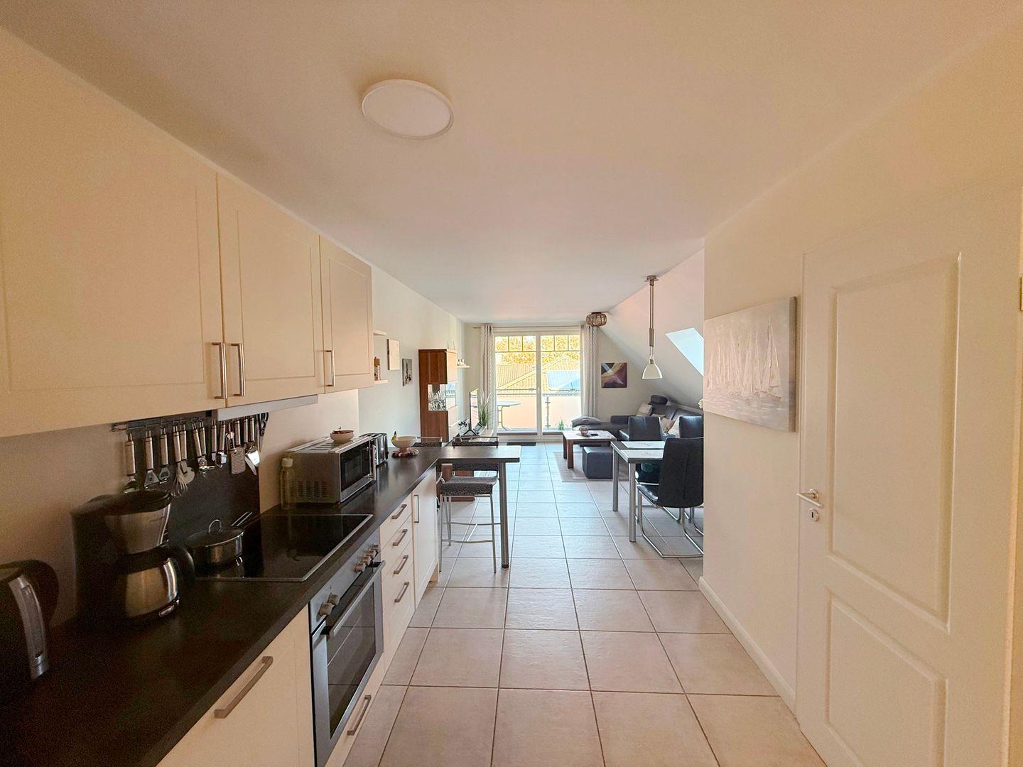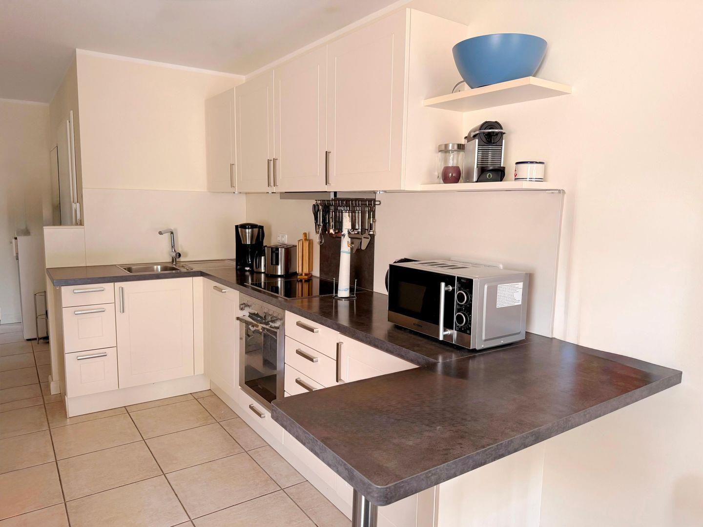 Die komplett eingerichtete Einbauküche verfügt über einen Herd mit Backofen, Spülmaschine, Kühl-/Gefrierkombination und Mikrowelle.