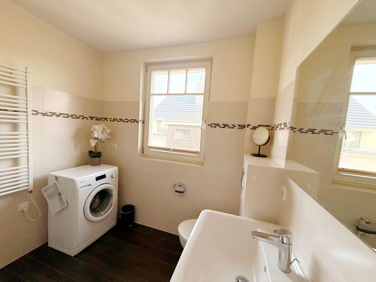 Das moderne Badezimmer überzeugt mit ebenerdiger Dusche, Fußbodenheizung, Fön, Handtuchtrockner und Waschmaschine. Ein separater Raum bietet zusätzlichen Stauraum für Koffer. Kostenlos nutzbar sind Baby-Hochstuhl, Kinderreisebett, WLAN, Fahrradstellplätze sowie ein eigener PKW-Stellplatz.