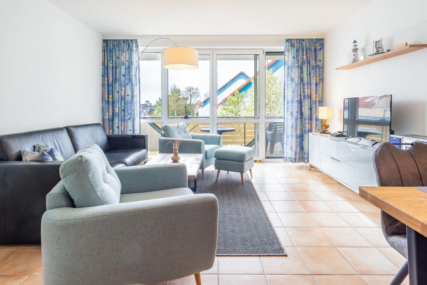 Die anspruchsvolle 50 m² große, gemütlich eingerichtete Ferienwohnung befindet sich in der Residenz am Strand und bietet Ihnen einen offenen Wohnbereich mit integrierter Küche.