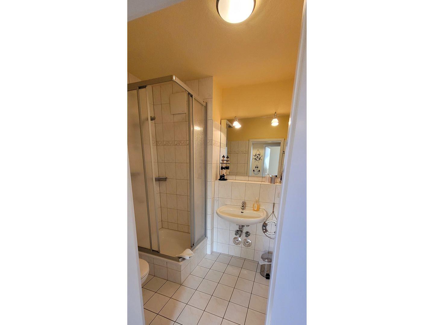Das Badezimmer ist mit einer Dusche ausgestattet.