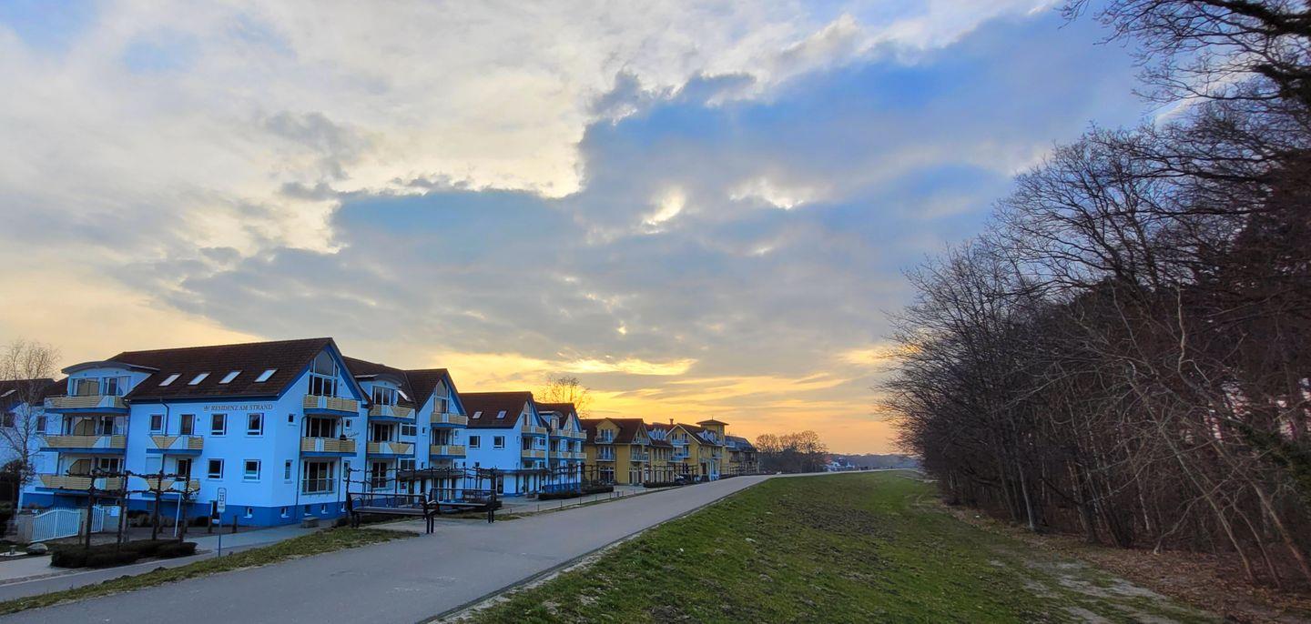 Die Wohnung befindet sich im 2. OG und hat zur See hin ein großes Panoramafenster mit angeschlossenem Balkon. Im Sommer schauen wir auf den Deich - in das grüne der Bäume, im Winter sehen wir auf die oft unruhige Ostsee.
