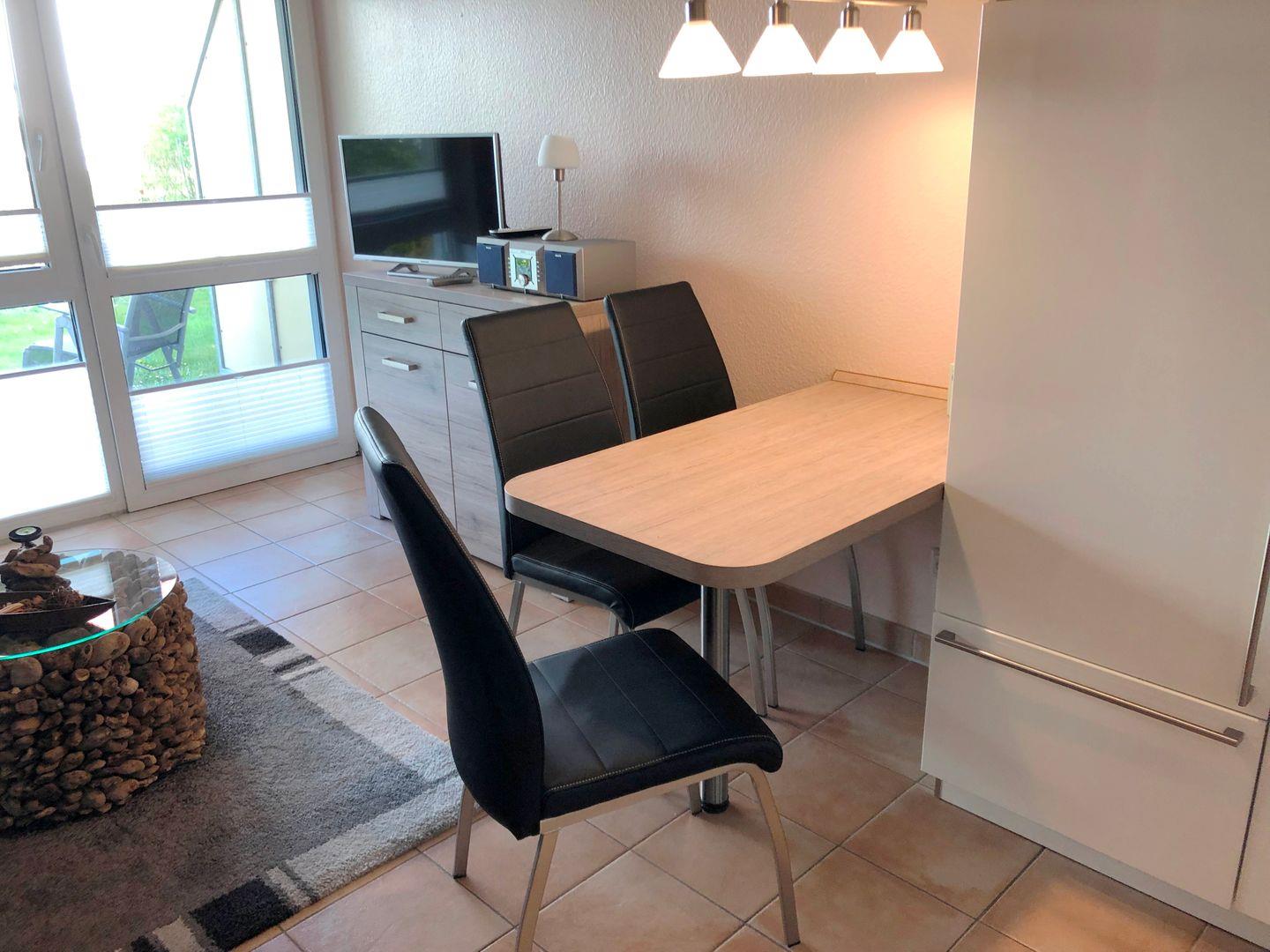 Sie befindet sich in der Residenz am Strand. Der Wohnraum mit TV, Sofa, Telefon und integrierter Küche lädt Sie zum Entspannen ein.