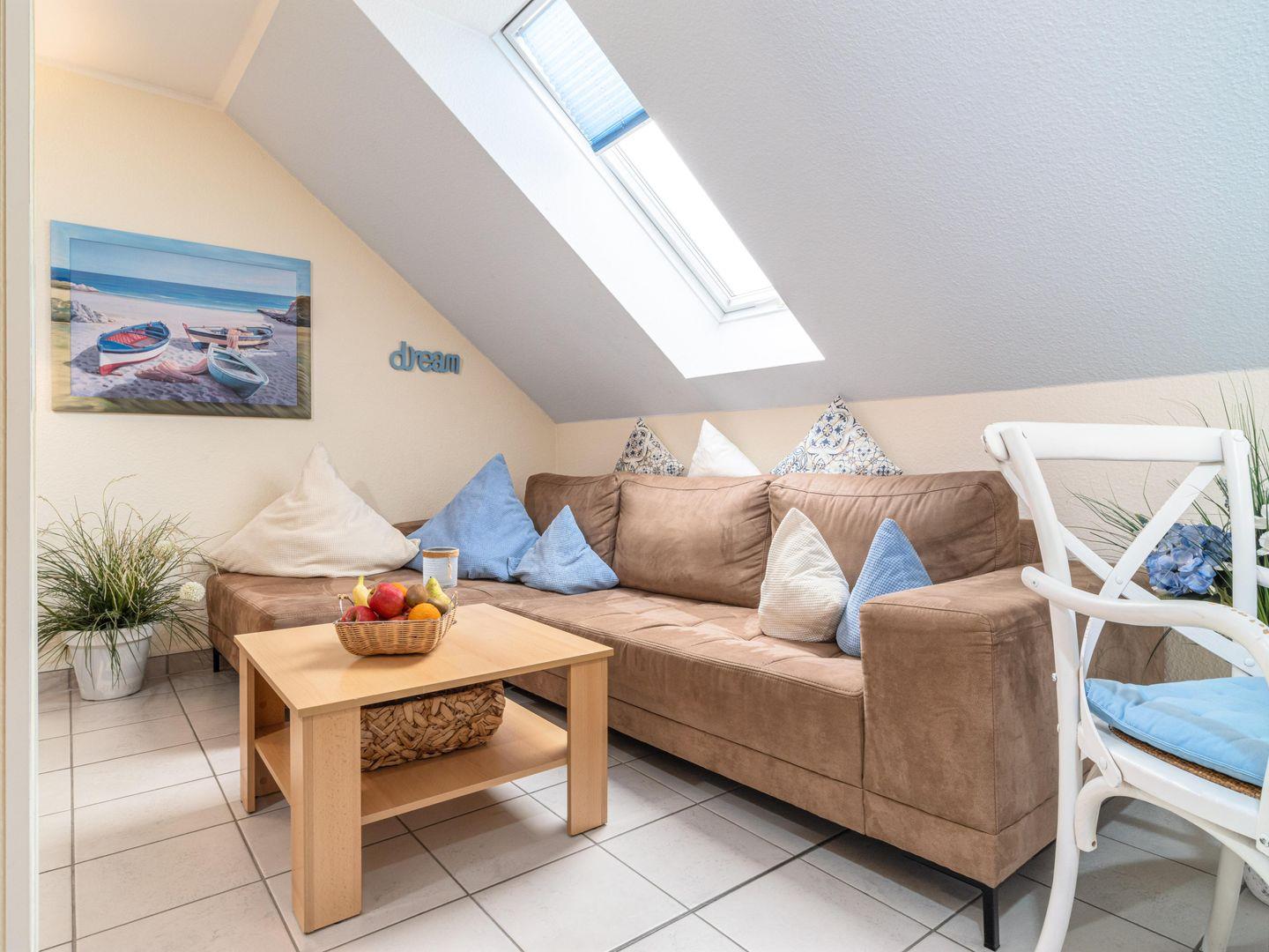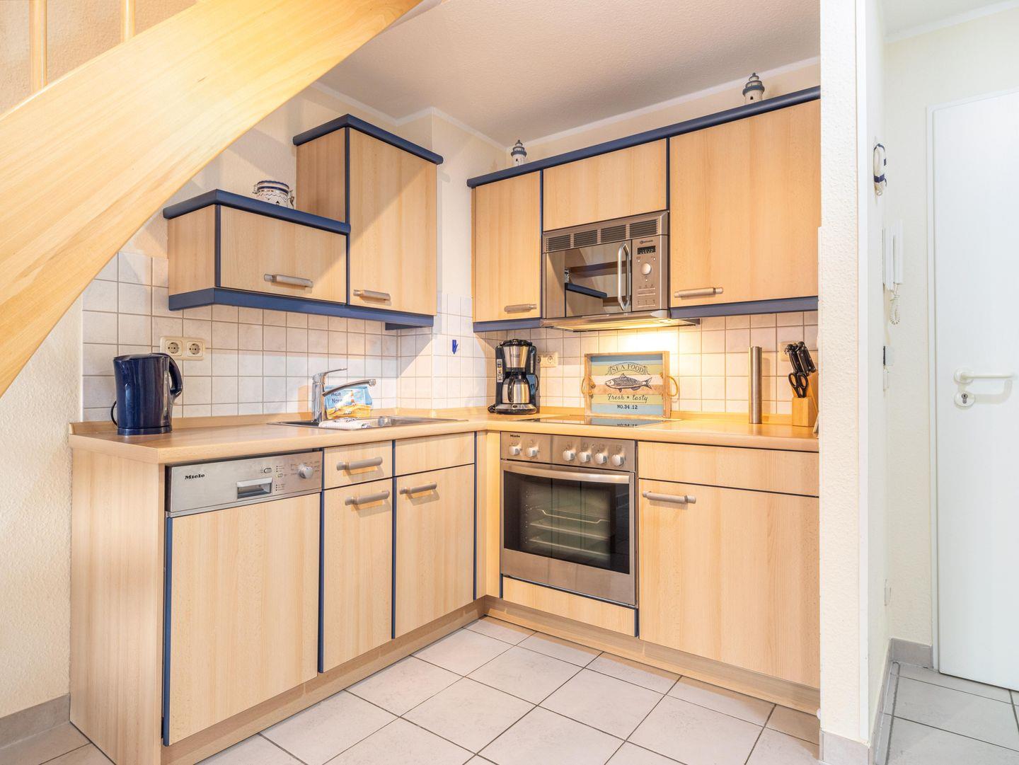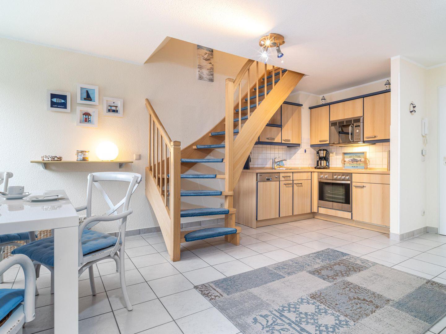 Im 2. Stock gelegen, erwartet Sie eine helle und freundliche Wohnung, die mit modernen Annehmlichkeiten ausgestattet ist. Das offene Wohnkonzept verbindet eine komplett ausgestattete Küche mit einem Essbereich und einem gemütlichen Wohnzimmer, das zum Entspannen einlädt. Hier können Sie den Tag mit einem leckeren Frühstück oder einem Glas Wein nach einem aufregenden Tag am Strand ausklingen lassen. Die integrierte Küchenzeile ist mit einem Cerankochfeld, einem Kühlschrank mit Gefrierfach, einer Mikrowelle und einer Spülmaschine ausgestattet – alles, was Sie für eine stressfreie Selbstversorgung benötigen.