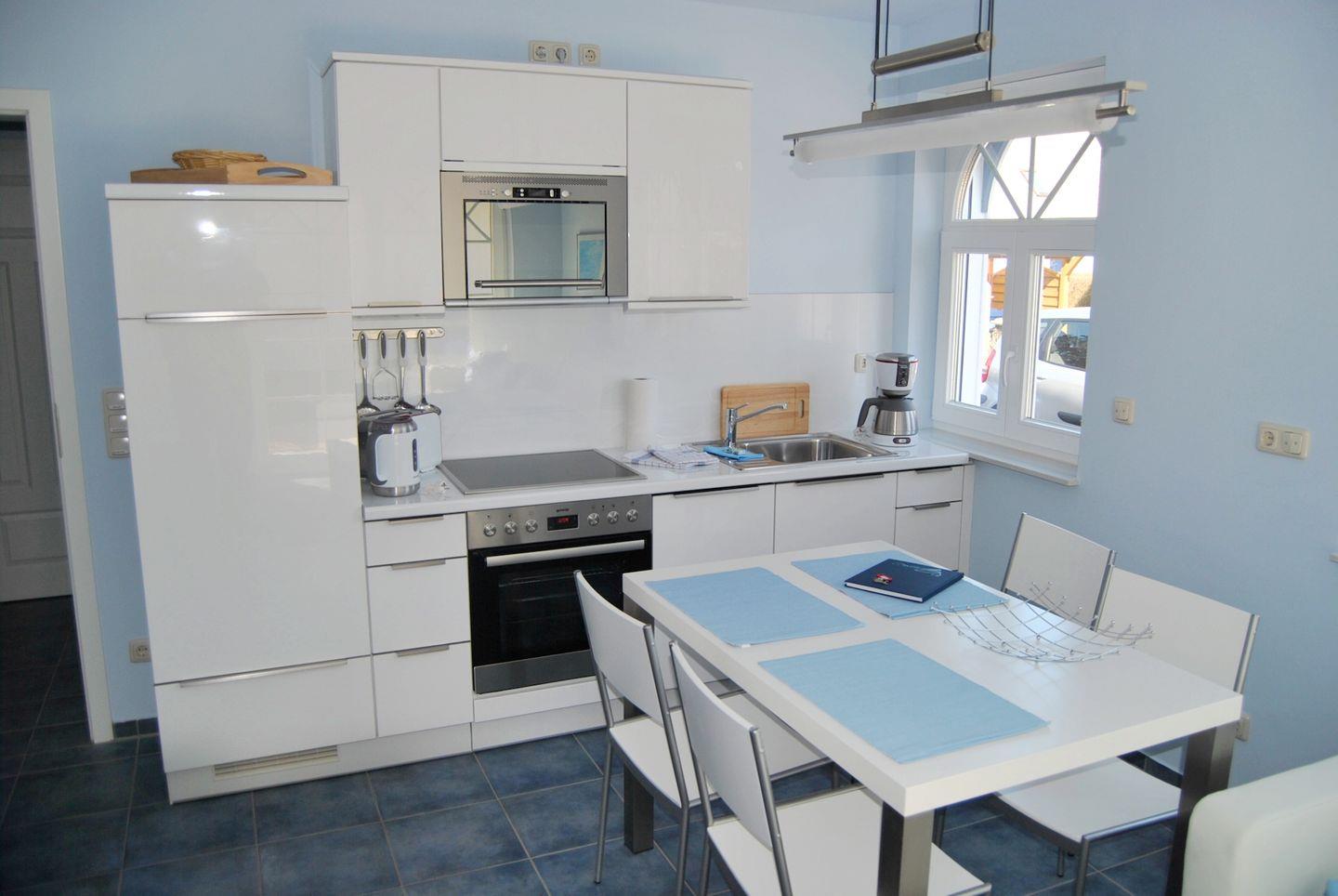 Der großzügig gestaltete Wohnbereich ist mit Fliesen ausgelegt und bietet ein gemütliches Sofa, einen Sessel sowie einen modernen Kaminofen für behagliche Stunden. Zur Unterhaltung steht Ihnen ein digitaler Fernseher sowie ein CD-Spieler und ein Radio zur Verfügung. Für das leibliche Wohl sorgt die offene, modern ausgestattete Küche, die nahtlos in den Wohnraum integriert ist. Hier finden Sie Ceranherd, Backofen, Mikrowelle, Spülmaschine, Kühlschrank mit Gefrierfach (als Fach im Kühlschrank), Wasserkocher, Kaffeemaschine, Toaster, Eierkocher sowie ausreichend Geschirr und Besteck. Die Erstausstattung für Küche und Bad ist bereits vorhanden. Ein Essbereich mit Esstisch steht für gemeinsame Mahlzeiten bereit.