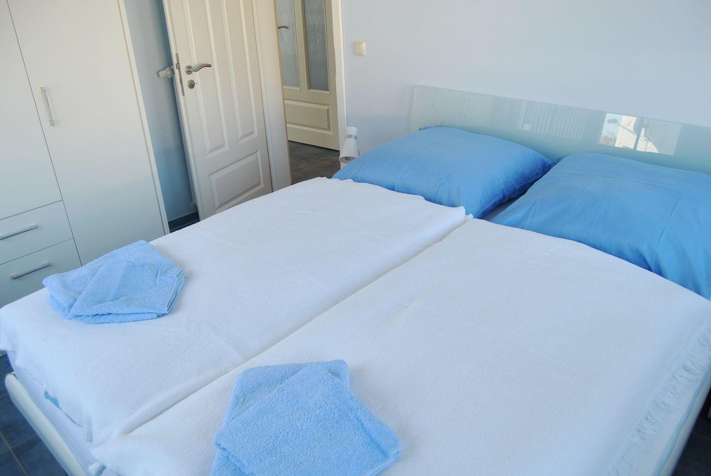 Das Schlafzimmer ist ebenfalls mit Fliesenboden versehen und lädt mit komfortabler Schlafmöglichkeit zum Entspannen ein. Insgesamt finden hier bis zu drei Gäste Platz. Im modernen Badezimmer erwartet Sie eine bodengleiche Dusche, WC, Waschbecken, Kosmetikspiegel und Föhn. Ein Ganzkörperspiegel steht ebenfalls zur Verfügung. Die Wohnung ist allergikerfreundlich ausgestattet und besitzt Fliegengitter an den Fenstern.