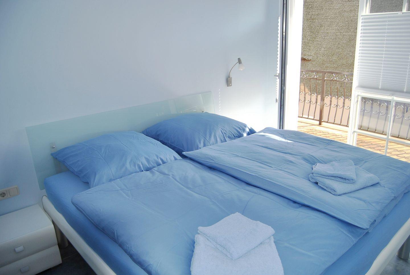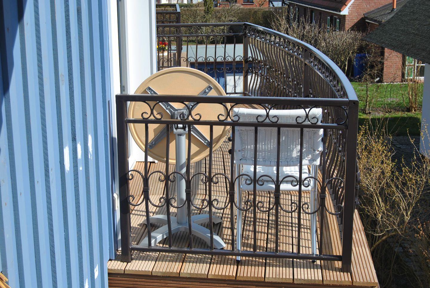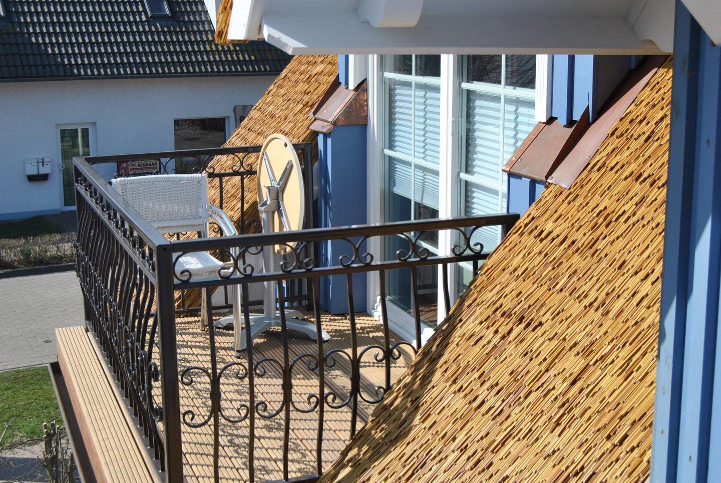Der private, möblierte Balkon ist mit Gartenmöbeln und Sonnenschirm versehen und bietet somit einen angenehmen Ort zum Entspannen nach einem Tag am Meer oder für das Lesen eines Buchs an der frischen Ostseeluft.