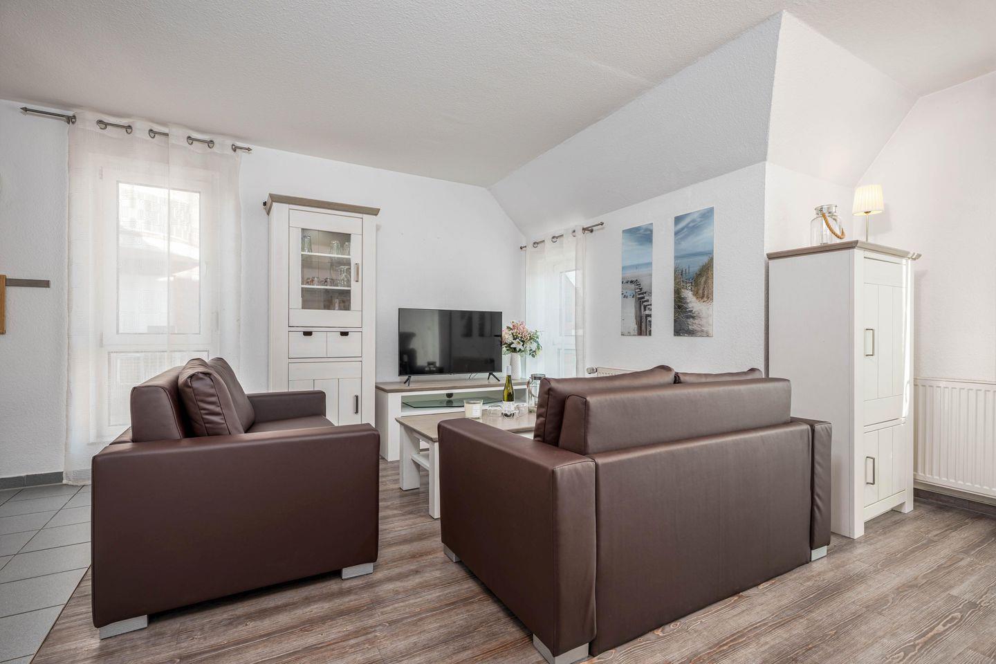 Der Wohnbereich ist offen und freundlich gestaltet. Im Wohnzimmer mit Laminatboden stehen Ihnen eine Sofaecke, ein Sofa, ein Esstisch sowie ein TV, Radio und CD-Spieler zur Verfügung. WLAN und Internet sorgen auch während Ihres Aufenthalts für eine komfortable Verbindung. Die offene Küche ist direkt in den Wohnbereich integriert und ermöglicht kurze Wege im Alltag. Sie ist mit Cerankochfeld, Backofen, Kühlschrank, Spülmaschine, Mikrowelle, Kaffeemaschine, Toaster, Wasserkocher, Mixer sowie Küchenutensilien, Geschirr, Besteck und Geschirrhandtüchern umfassend ausgestattet.
