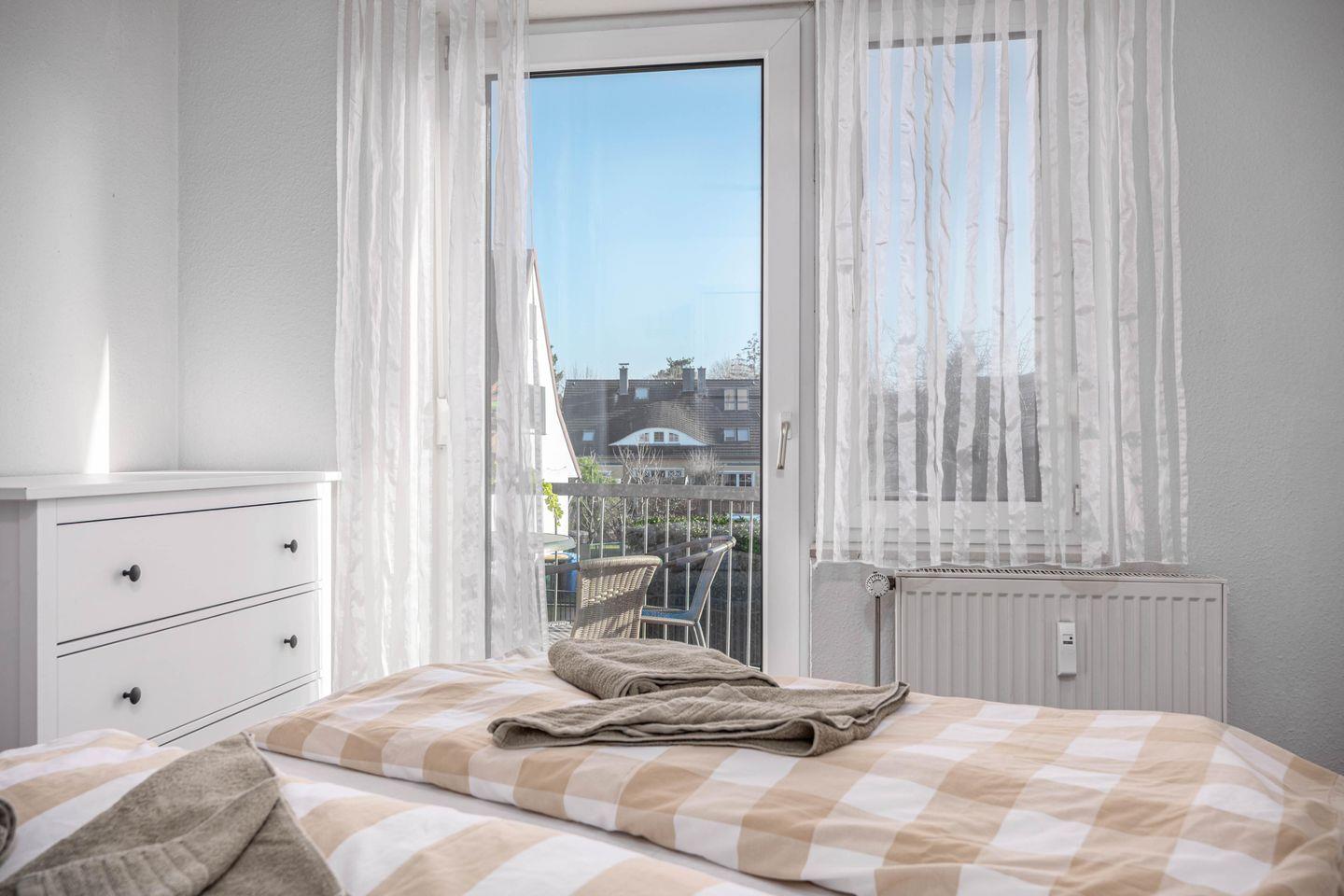 Ein Balkon mit Gartenmöbeln erweitert den Wohnraum nach draußen und bietet Ihnen die Möglichkeit, Mahlzeiten oder ruhige Stunden im Freien zu genießen. Zur Wohnung gehört ein kostenloser Privatparkplatz. Auch praktische Ausstattungsmerkmale für längere Aufenthalte sind vorhanden, darunter gemeinschaftlich nutzbare Waschmaschine und Trockner.