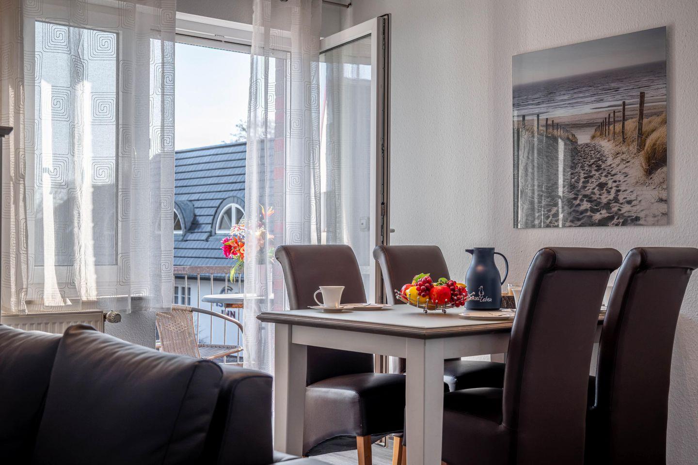 Die Wohnung Bahnhofstraße 10 - Wohnung 3 befindet sich im 1. Stock in Zingst und bietet auf 62 m² eine gut durchdachte Unterkunft für bis zu 4 Personen. Mit insgesamt 3 Zimmern, darunter 2 Schlafzimmer, eignet sie sich besonders für Familien, Paare oder kleine Reisegruppen, die eine gepflegte und praktisch ausgestattete Ferienwohnung in stadtnaher Lage suchen. Die Innenstadt erreichen Sie nach nur 400 m, Restaurants ebenfalls nach 400 m. Das Meer und der Strand liegen etwa 900 m entfernt, ebenso der öffentliche Nahverkehr. Einkaufsmöglichkeiten befinden sich in rund 950 m Entfernung.