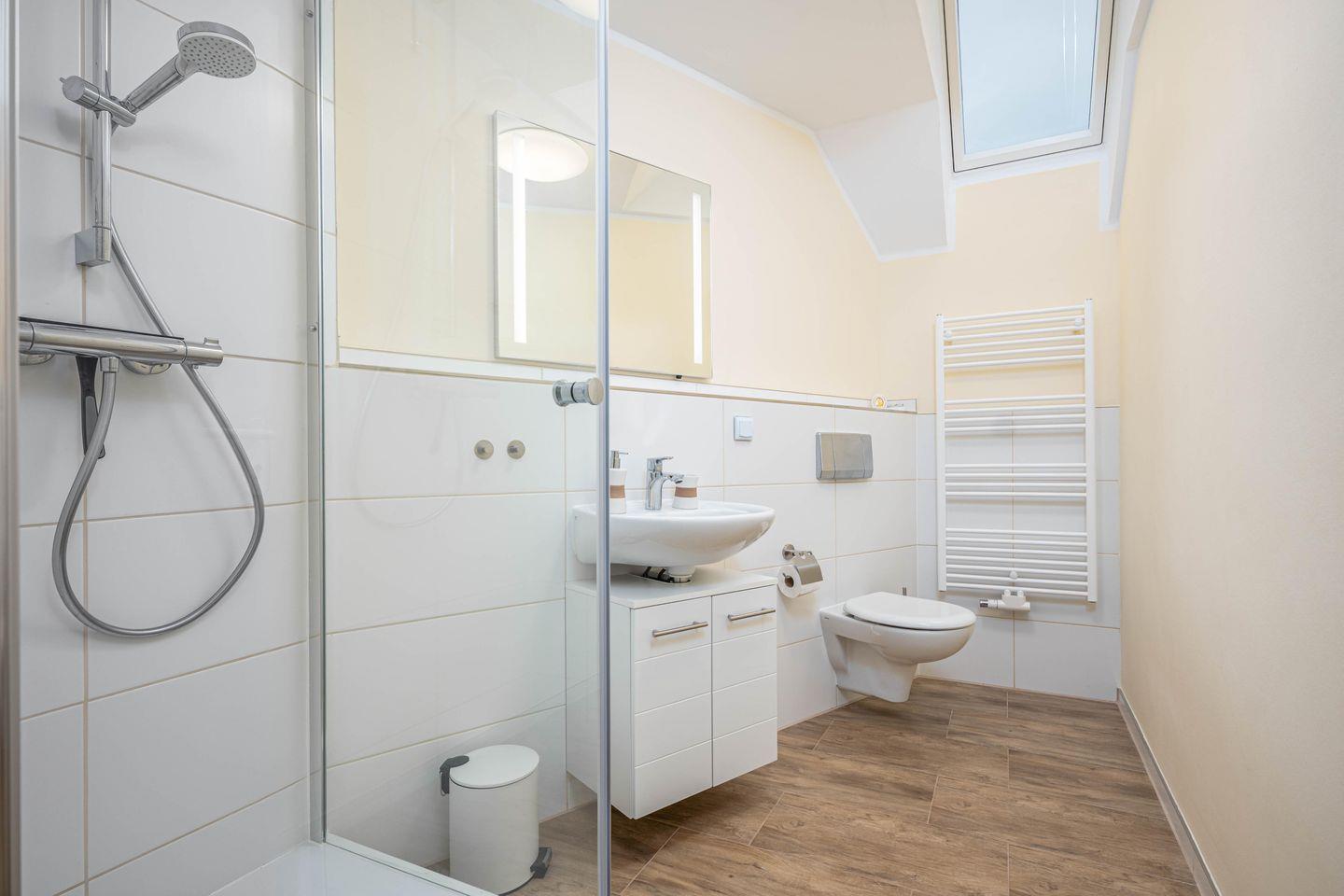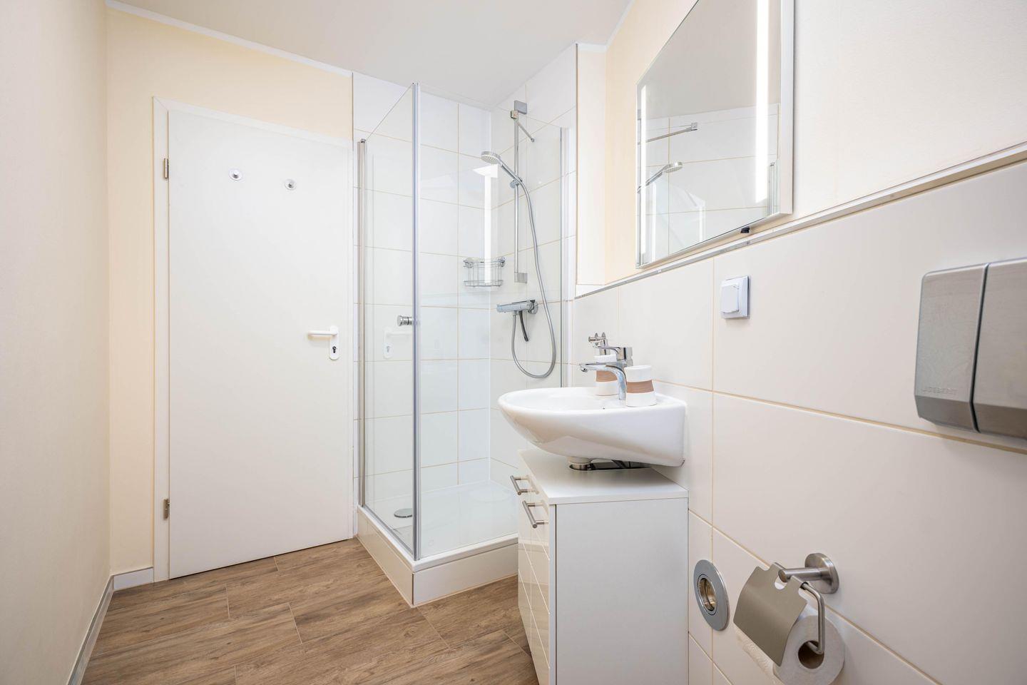 Die beiden Schlafzimmer verfügen ebenfalls über Laminatboden und bieten angenehme Voraussetzungen für erholsame Nächte. Das Badezimmer ist mit einer bodengleichen Dusche, WC, Waschbecken, Spiegel, Kosmetikspiegel, Haartrockner und Fenster ausgestattet. Sichtschutz an allen Fenstern und Fliegengitter tragen zusätzlich zum Komfort bei.