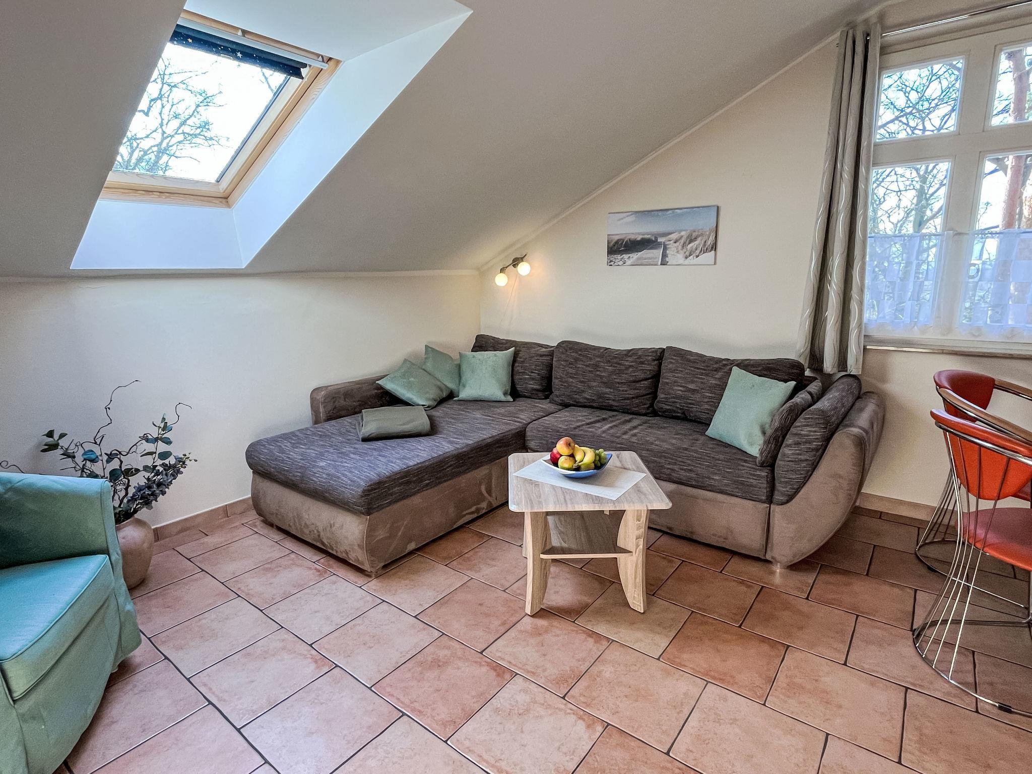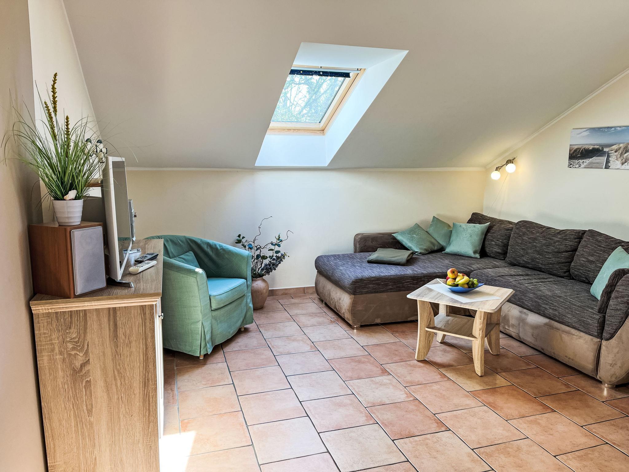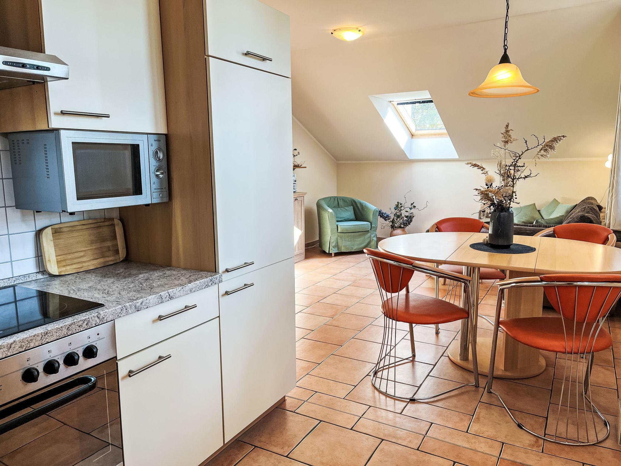 "Zaunkönig", 2-room apartment 50 m2, on the top floor. With sloping ceilings, cosy furnishings: living/dining room with 1 double sofabed and cable TV (flat screen), radio. 1 room with 1 double bed. Kitchenette (dishwasher, 4 ceramic glass hob hotplates, toaster, kettle, microwave, electric coffee machine). Shower/WC. Facilities: children's high chair, baby cot. Parking (1 car) at the house. Please note: non-smokers only. Smoke alarm.