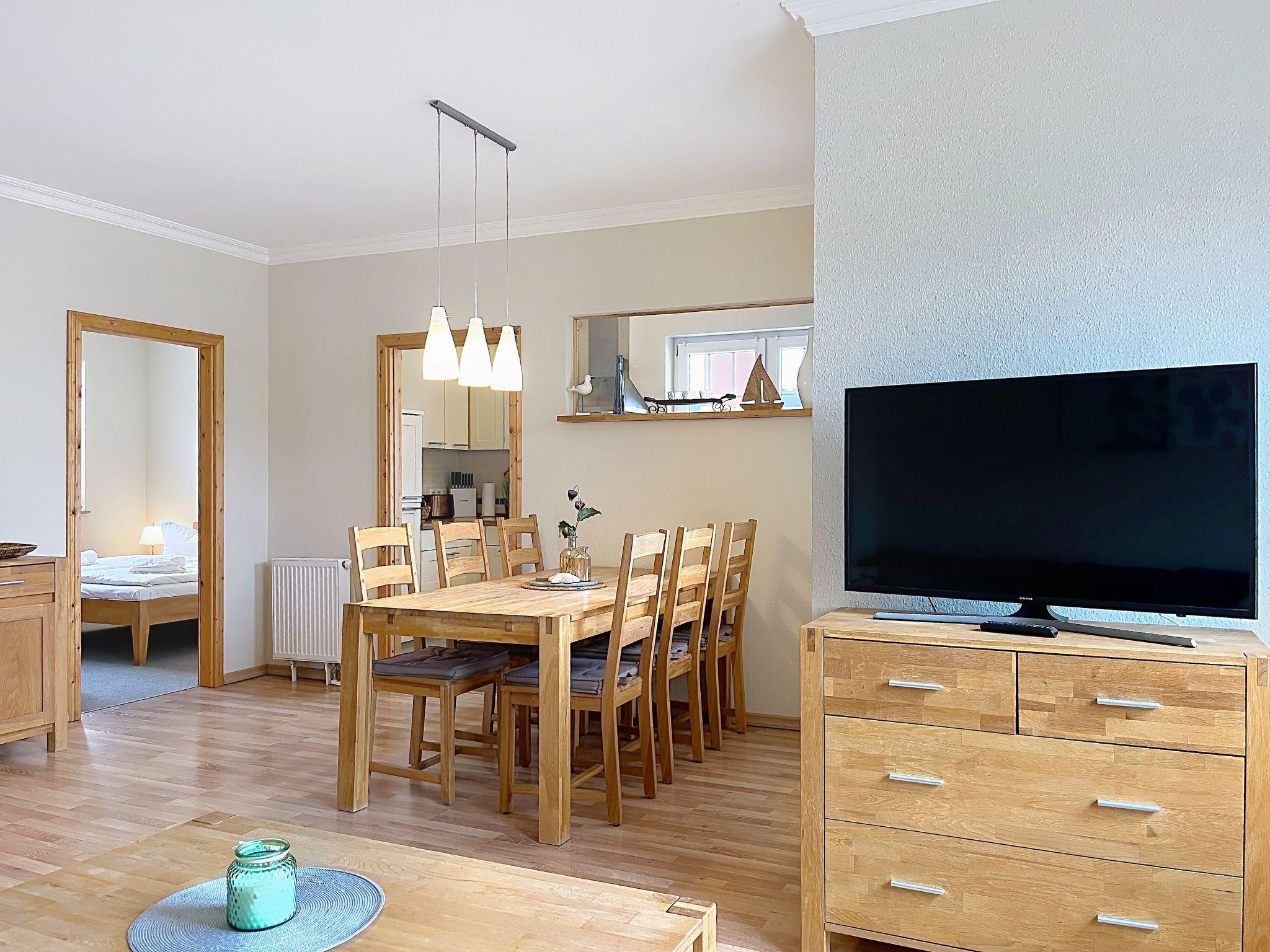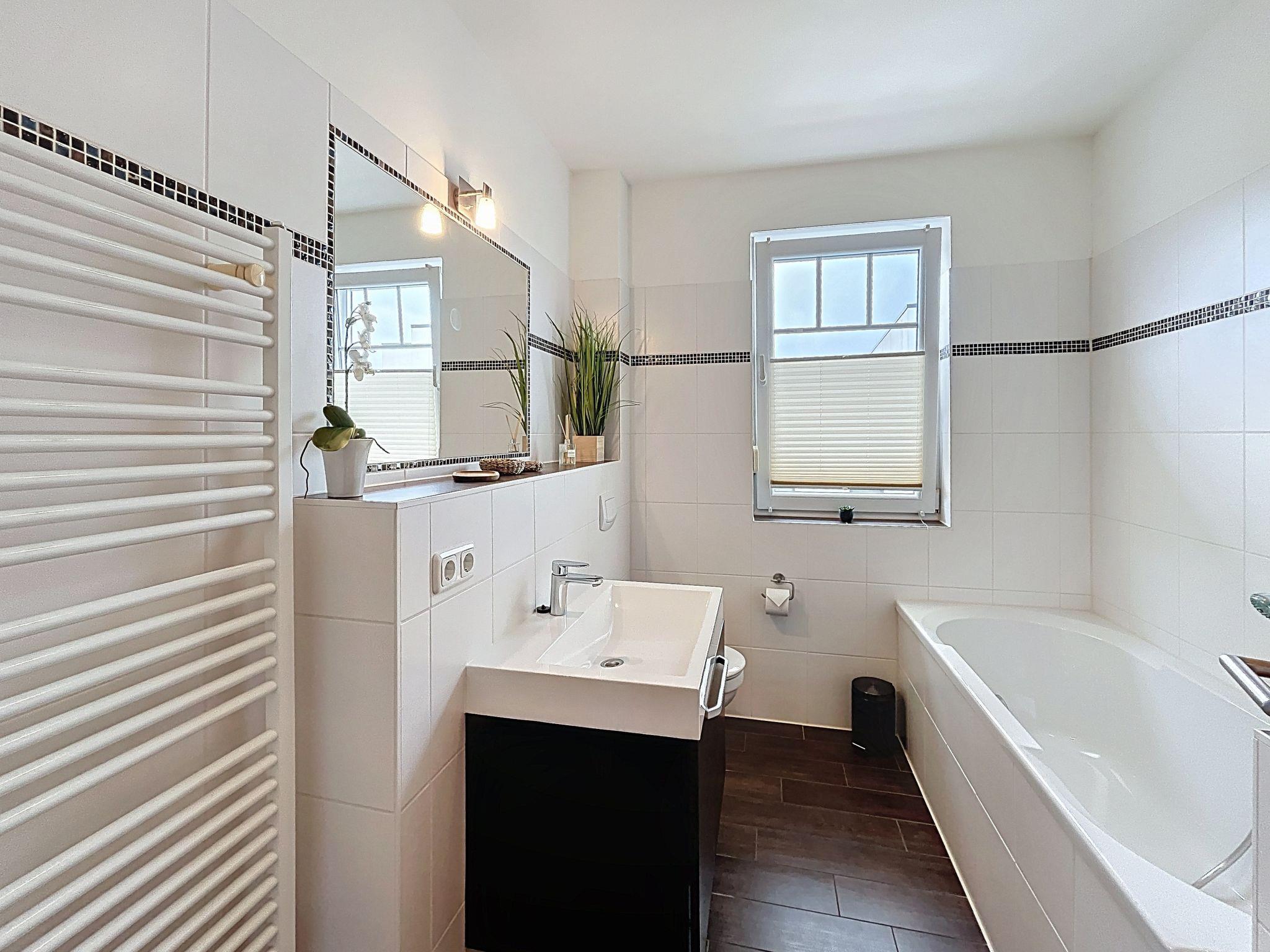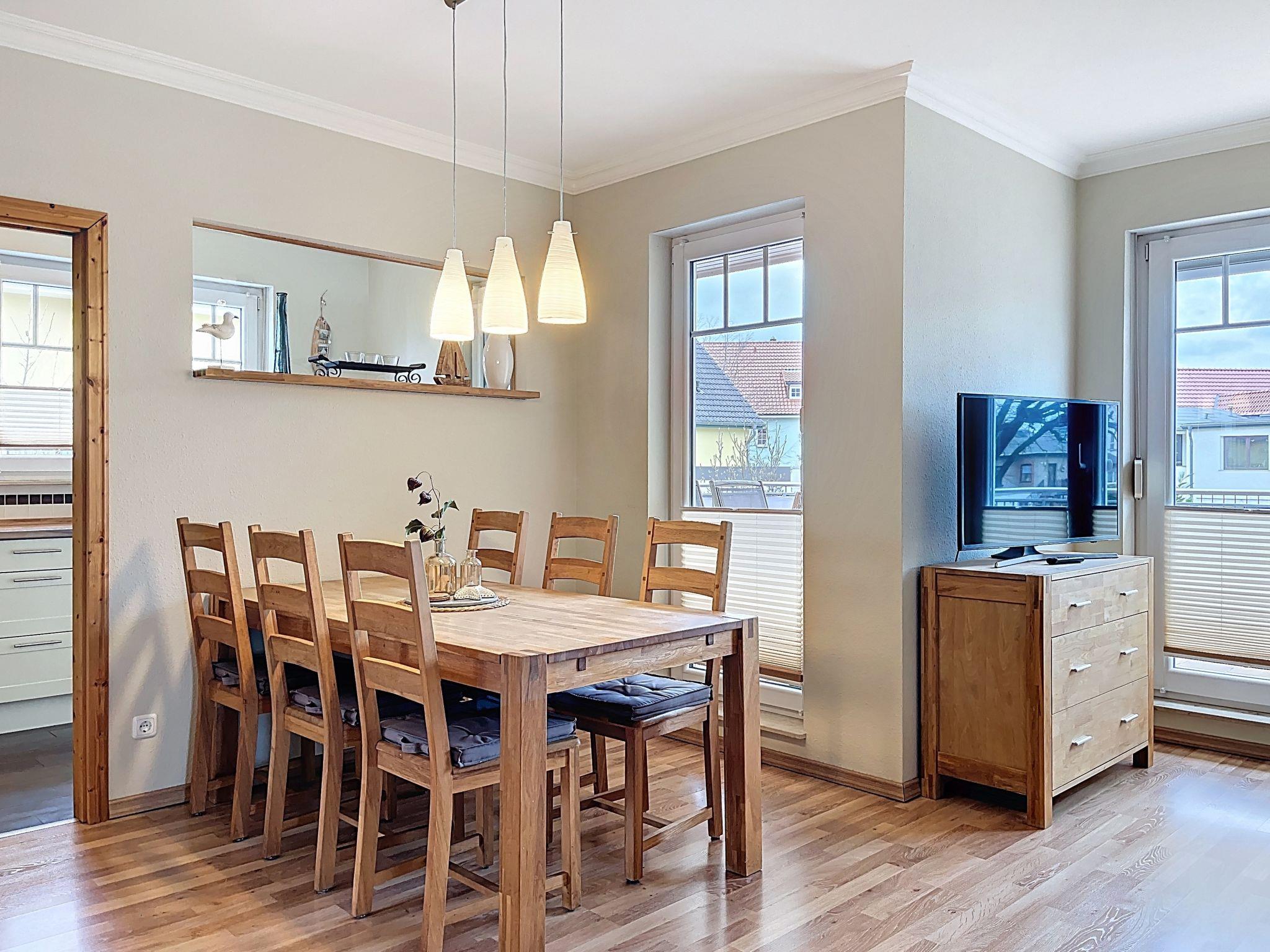"Zinnowitz Ambiente", 3-room apartment on 1st floor. Object suitable for 4 adults + 2 children. Spacious and bright, comfortable and tasteful furnishings: living/dining room with dining table and satellite TV (flat screen), hi-fi system and DVD. Exit to the balcony. 1 room with 1 x 2 bunk beds, 1 double bed. 1 room with 1 double bed. Kitchen (oven, dishwasher, 4 ceramic glass hob hotplates, toaster, kettle, microwave, electric coffee machine). Bath/WC, shower/WC. Heating. Large balcony. Balcony furniture. Facilities: hair dryer. Internet (WiFi, free). Parking. Please note: non-smokers only. Smoke alarm.