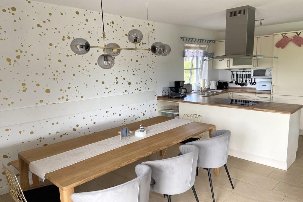 Das Ferienhaus 'Windblume' ist ein neugebautes Ferienhaus mit großer Sonnenterrasse, in dem sechs Erwachsene + 1 Kind auf ca. 115 m² Wohnfläche Urlaub machen können. Das liebevoll und modern eingerichtete Haus mit Blick auf das Achterwasser, bietet zu jeder Jahreszeit alles, was man zum Erholen und zur Entspannung braucht. Im Haus befinden sich zwei Doppelschlafzimmer und ein Familienschlafzimmer, das mit einem Doppelbett und einem Kinderbett ausgestattet ist. Platz für ein eigenes weiteres Kinderreisebett wäre vorhanden. Das Bad im Erdgeschoss verfügt über eine geräumige Sauna. Der Kaminofen im Wohn- und Essbereich sorgt an weniger warmen Tagen für romantische Gemütlichkeit. Es erwartet Sie eine vollständig eingerichtete Küche. Das Ferienhaus ist Anfang 2021 komplett neu eingerichtet worden.