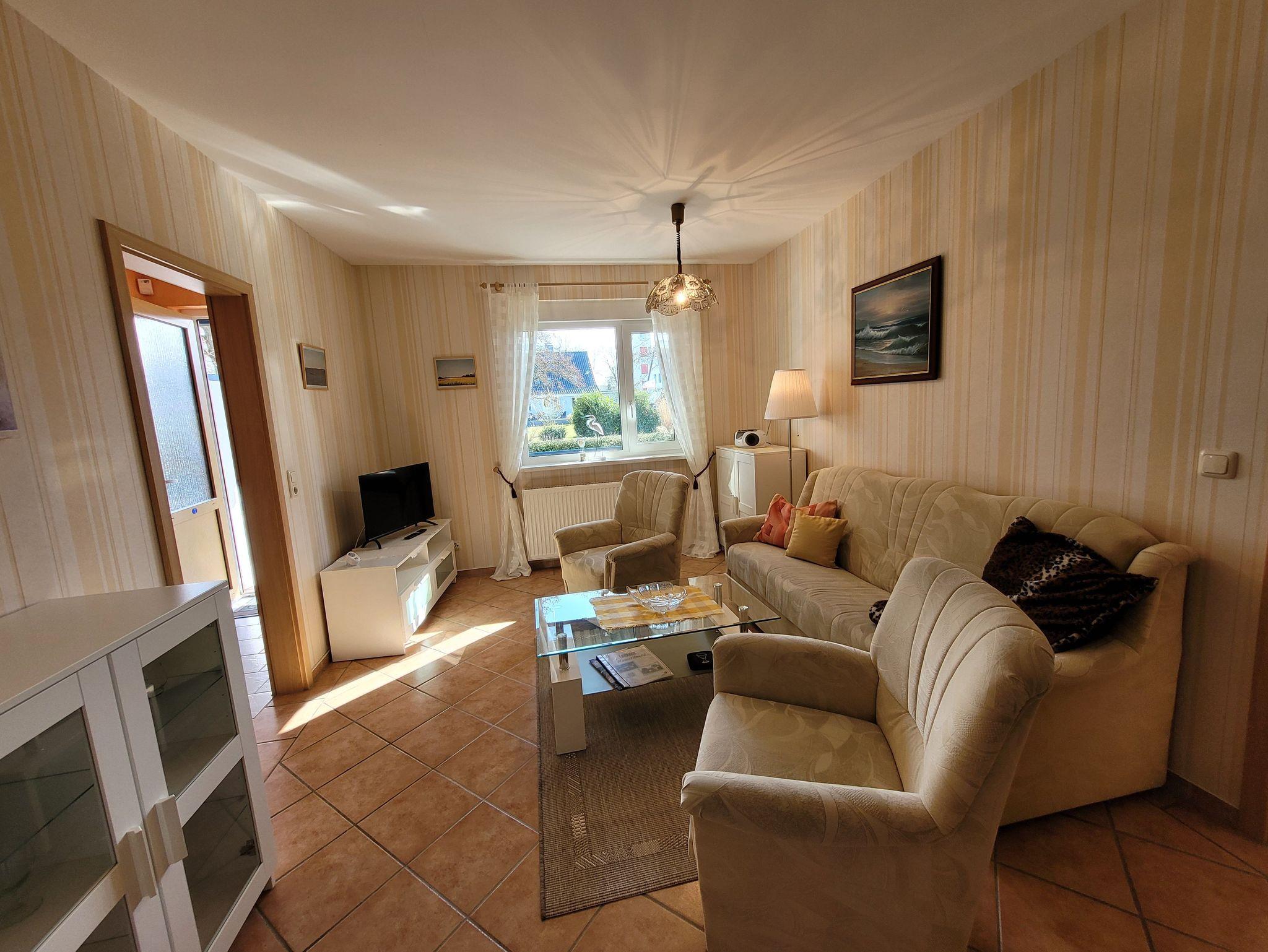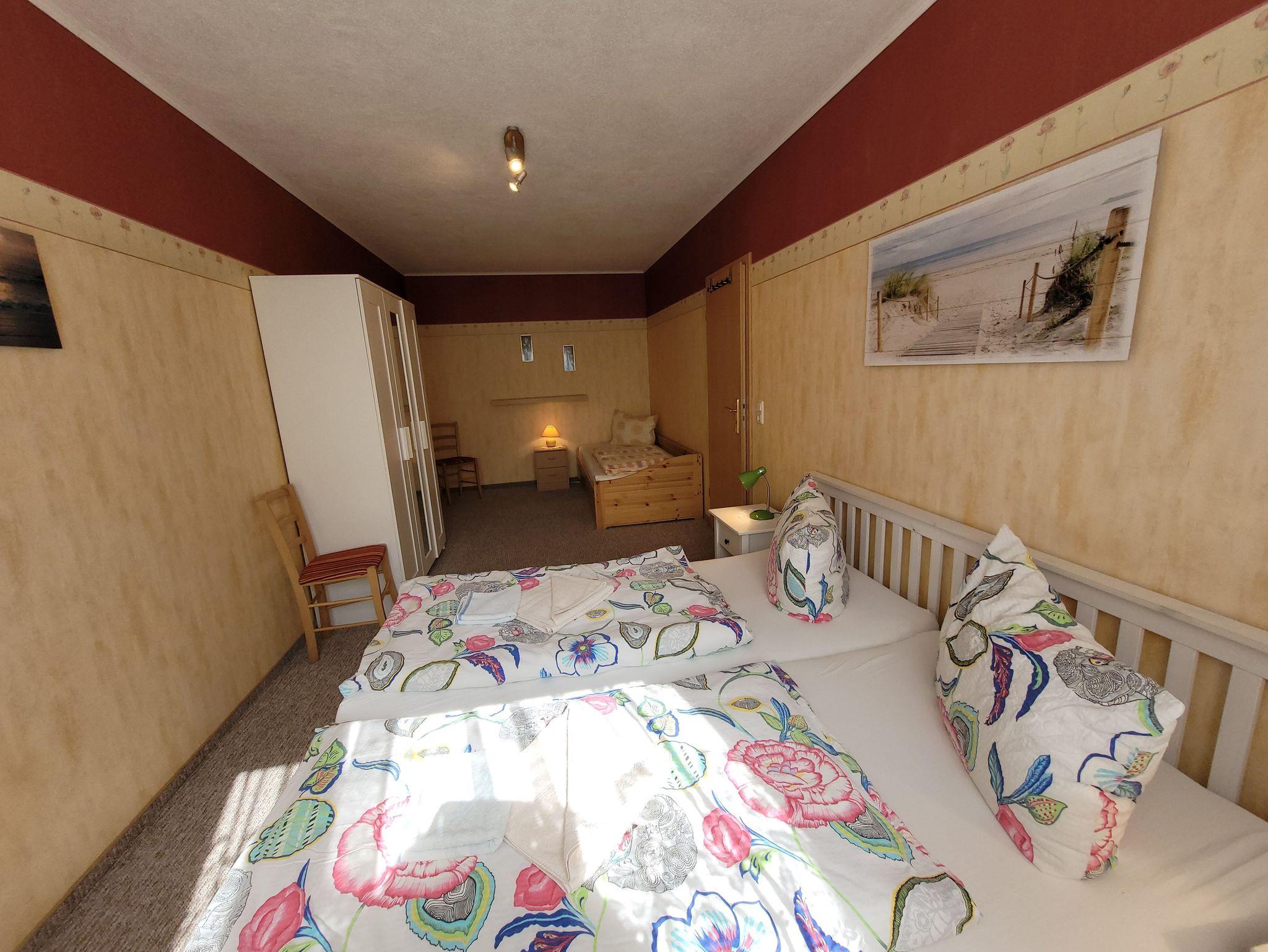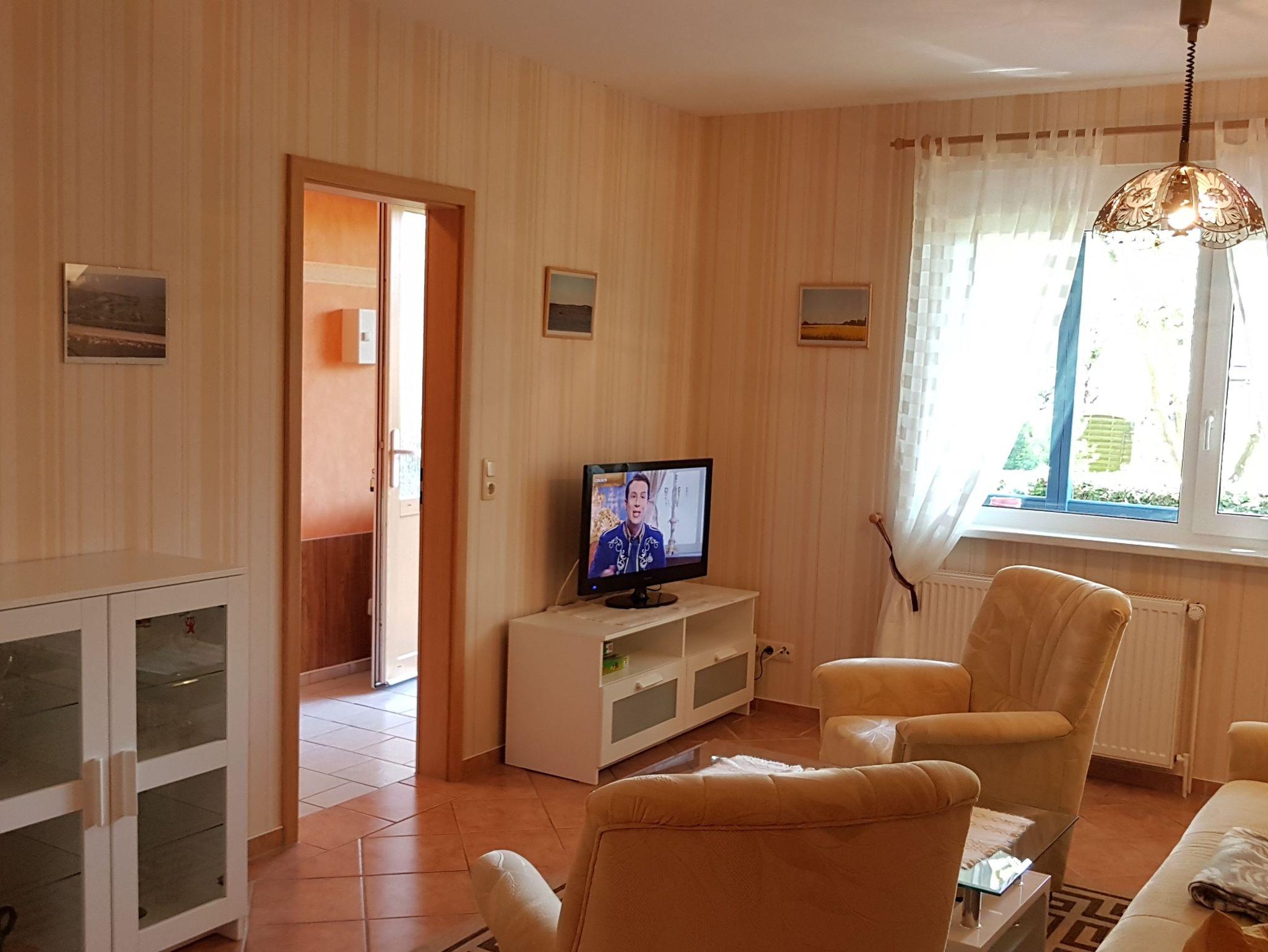 Unser Ferienhaus liegt ca.15 Geh-Minuten vom Strand entfernt in einer ruhigen Wohnlage. Die komplett eingerichtete Ferienwohnung mit Wohnzimmer, ein Schlafzimmer mit einem Ehebett und einem Einzelbett, Küchenzeile, Dusche, WC, Flur und großem Balkon/Terrasse würde für Sie bereitstehen. Zur Ausstattung gehören weiter Radio, Fernseher, einmalig Bettwäsche und Handtücher. In der Küchenzeile sind Mikrowelle, Kaffeemaschine und Toaster, Eier-und Wasserkocher sowie ein 2-Platten-Kocher, Kühlschrank und Geschirr vorhanden. Eine Aufbettung ist im Wohnzimmer nach Absprache auf dem ausziehbarem Sofa möglich. Zu jeder Wohnung gehört ein kostenloser Parkplatz für Ihr Auto.