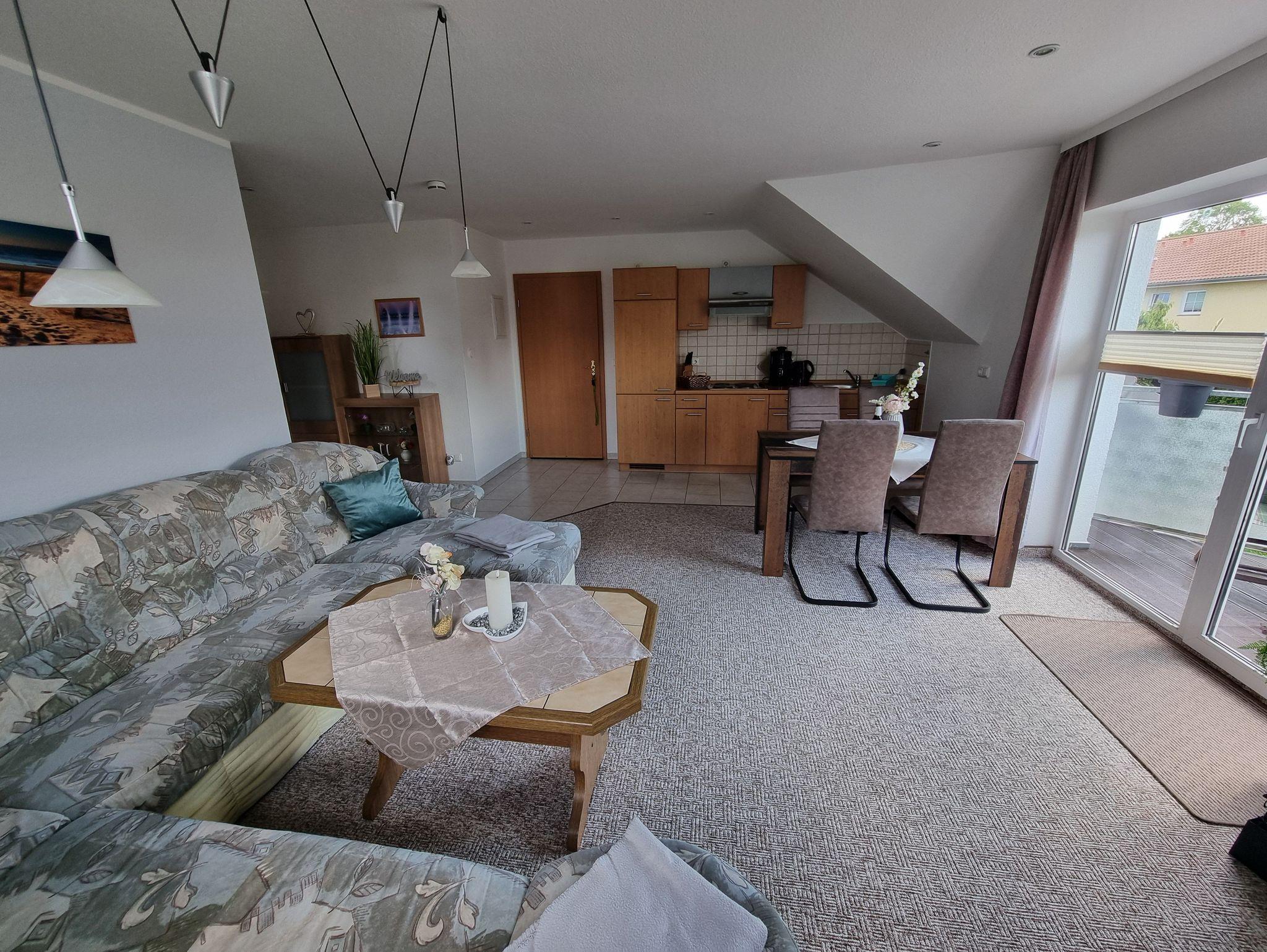 Die Ferienwohnung hat ein Schlafzimmer mit einem großen Doppelbett und ein Wohnbereich mit offener Küche. Es gibt eine gemütliche Couch, SAT-TV und eine gut ausgestattete Küche mit Essbereich.