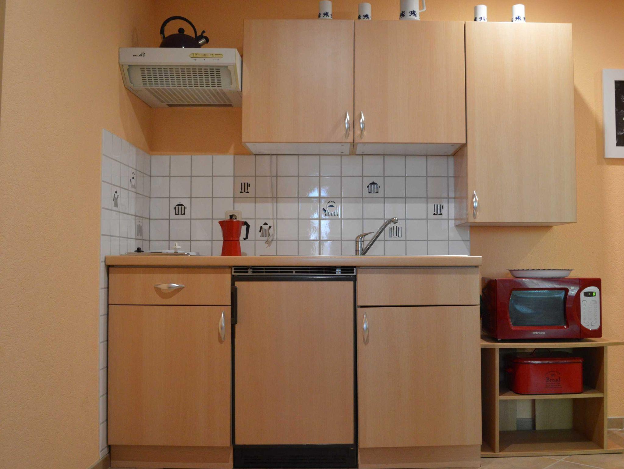 Das gemütliche Wohnzimmer ist mit einer Couch-Garnitur, Kommode und Fernseher ausgestattet. Das Schlafzimmer verfügt über ein Doppelbett, Kleiderschrank und zweitem Fernseher. Eine Pantryküche mit einen 2-Platten-Herd, Kühlschrank und Mikrowelle, Kaffeemaschine, Wasserkocher, Toaster sowie ein Bad mit Dusche und WC macht die Wohnung komplett. Die komplette Wohnung ist mit Laminat bzw. Fliesen ausgelegt. Erstausstattung Bettwäsche und Handtücher ist im Preis inklusive.