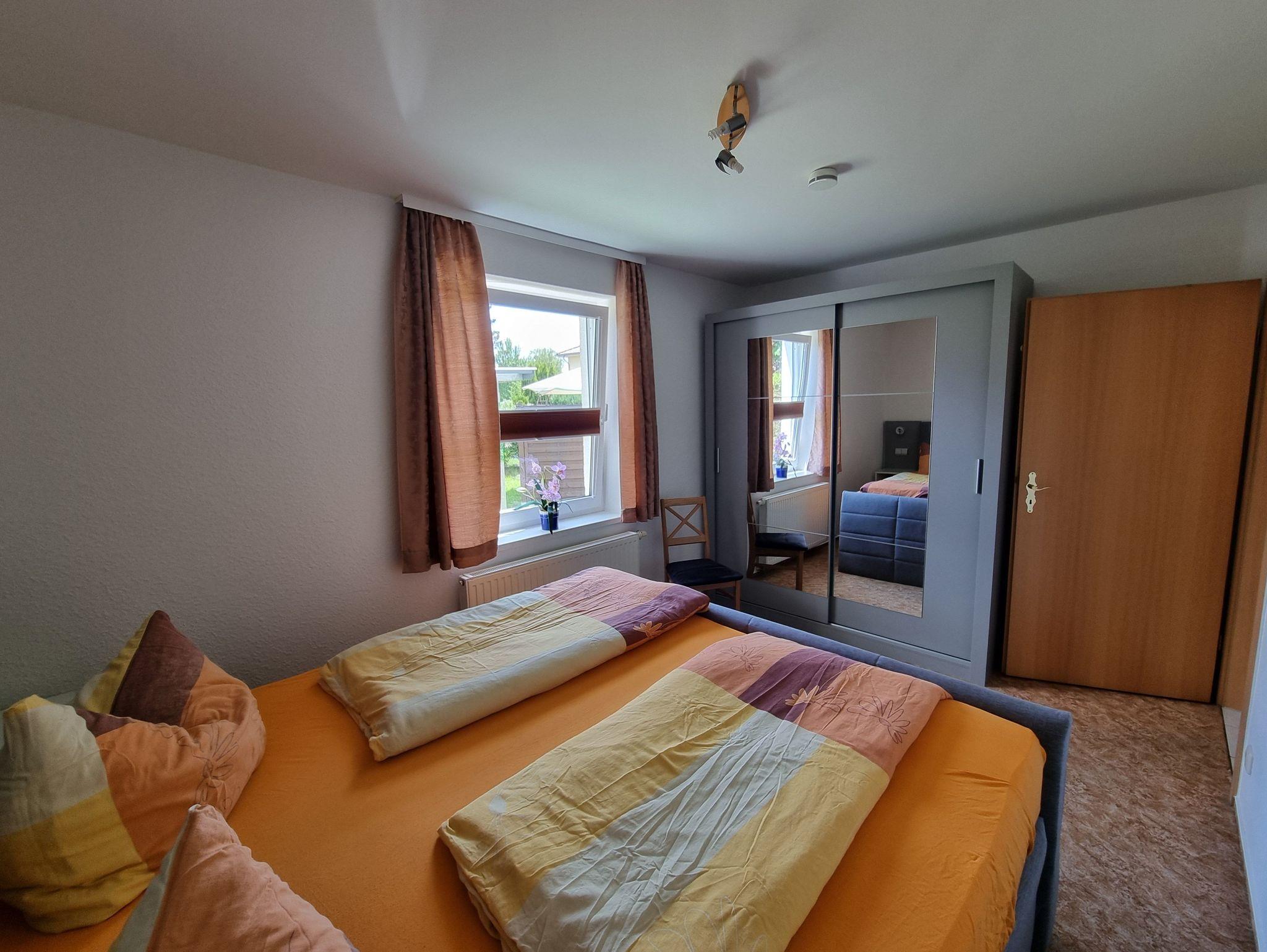 Die Ferienwohnung hat ein Schlafzimmer mit einem großen Doppelbett und ein Wohnbereich mit offener Küche. Es gibt eine gemütliche Couch, SAT-TV und eine gut ausgestattete Küche mit Essbereich.