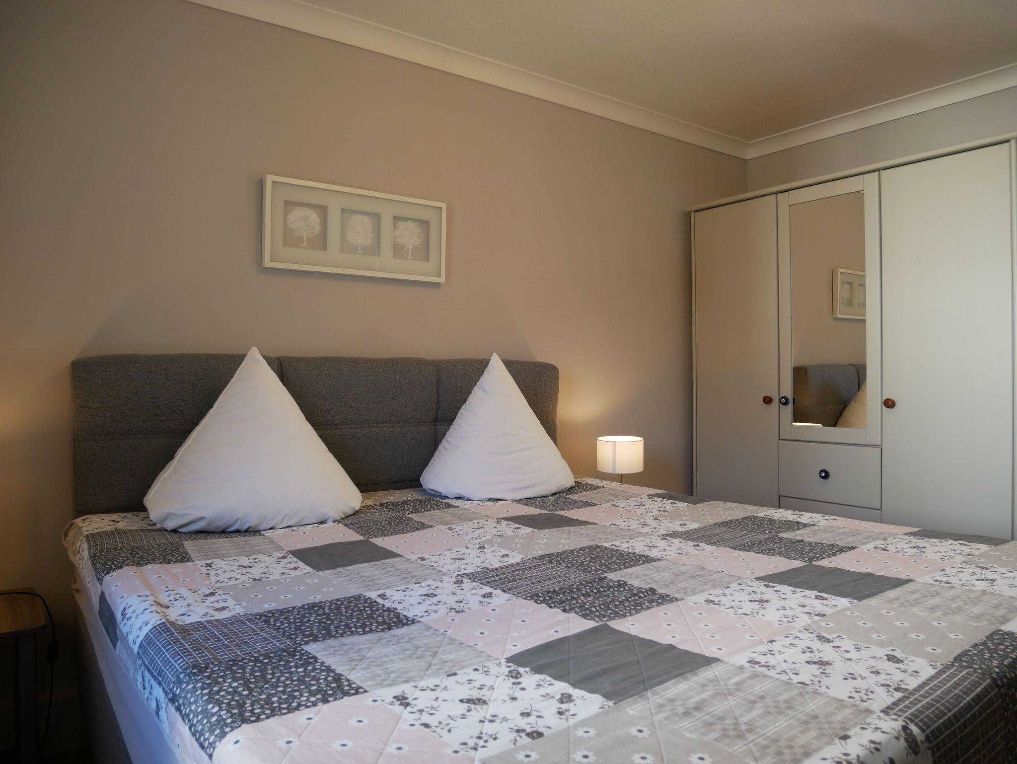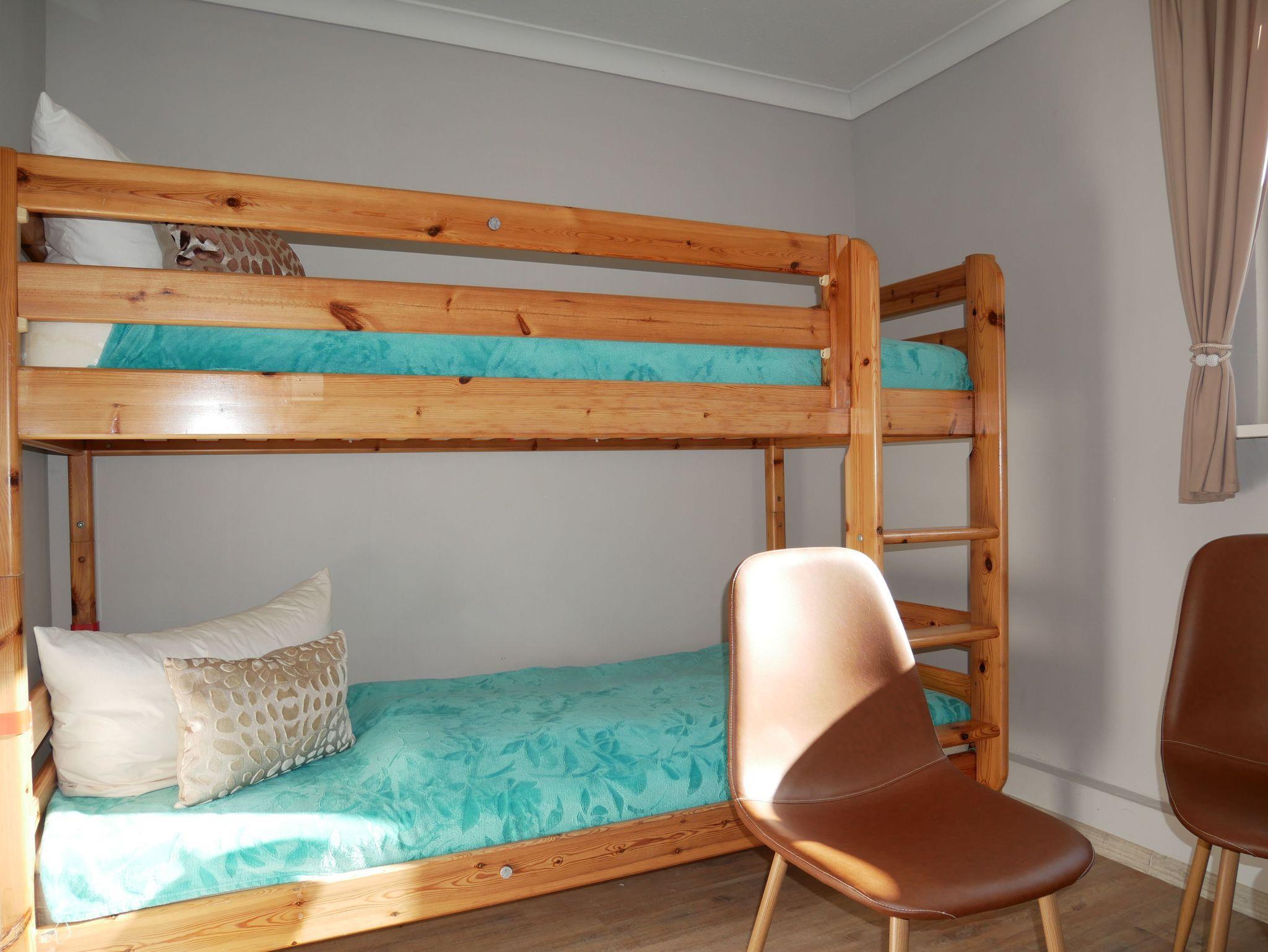 Das erste der drei Schlafzimmer ist mit einem komfortablen Doppelbett ausgestattet, während im zweiten Schlafzimmer ein Etagenbett und im dritten ein Tandembett auf Sie warten. In allen Schlafzimmern bieten geräumige Kleiderschränke genügend Platz für Ihre Urlaubsgarderobe.