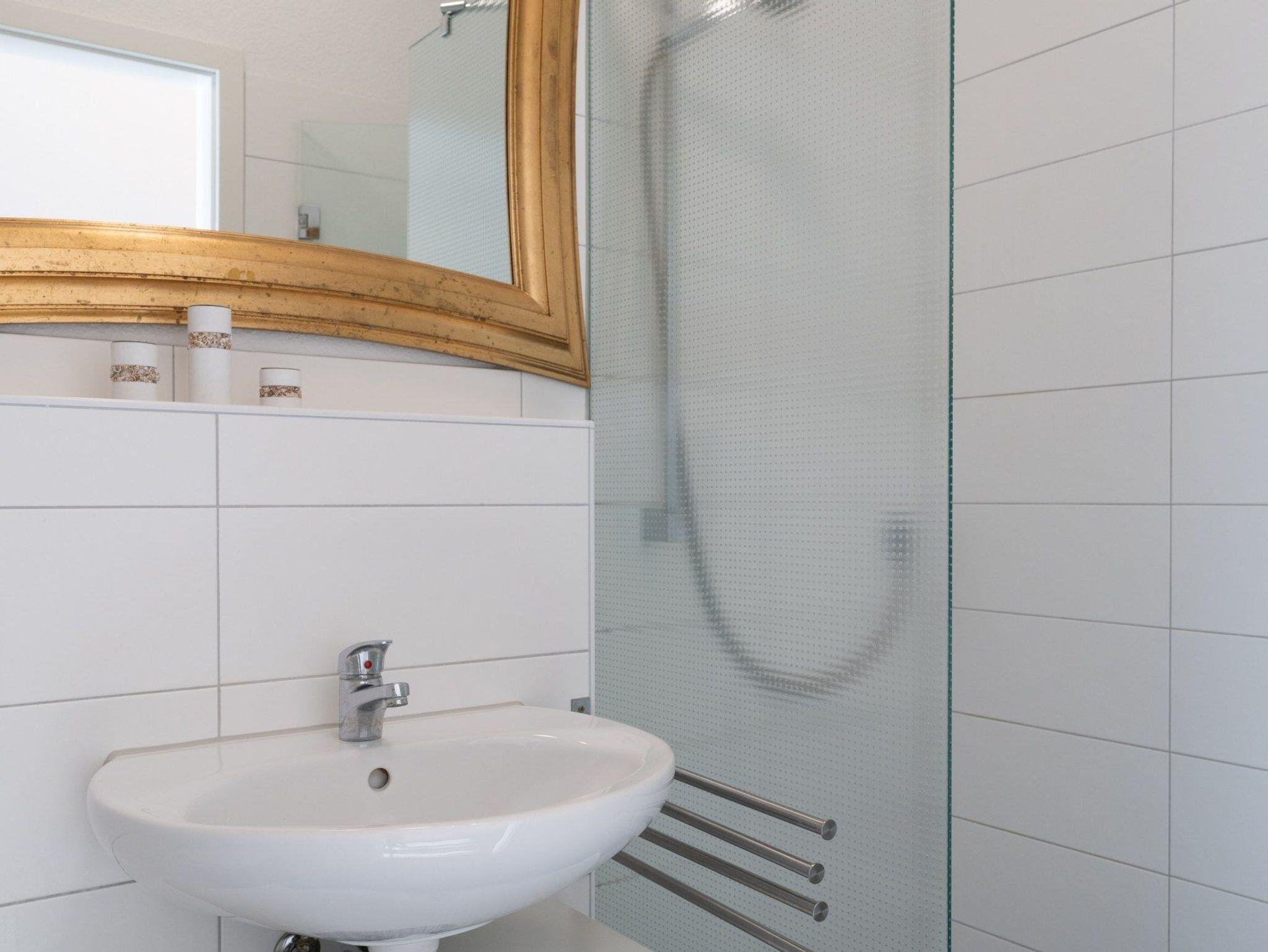 Das Badezimmer verfügt über eine Dusche (ebenerdig) und WC.