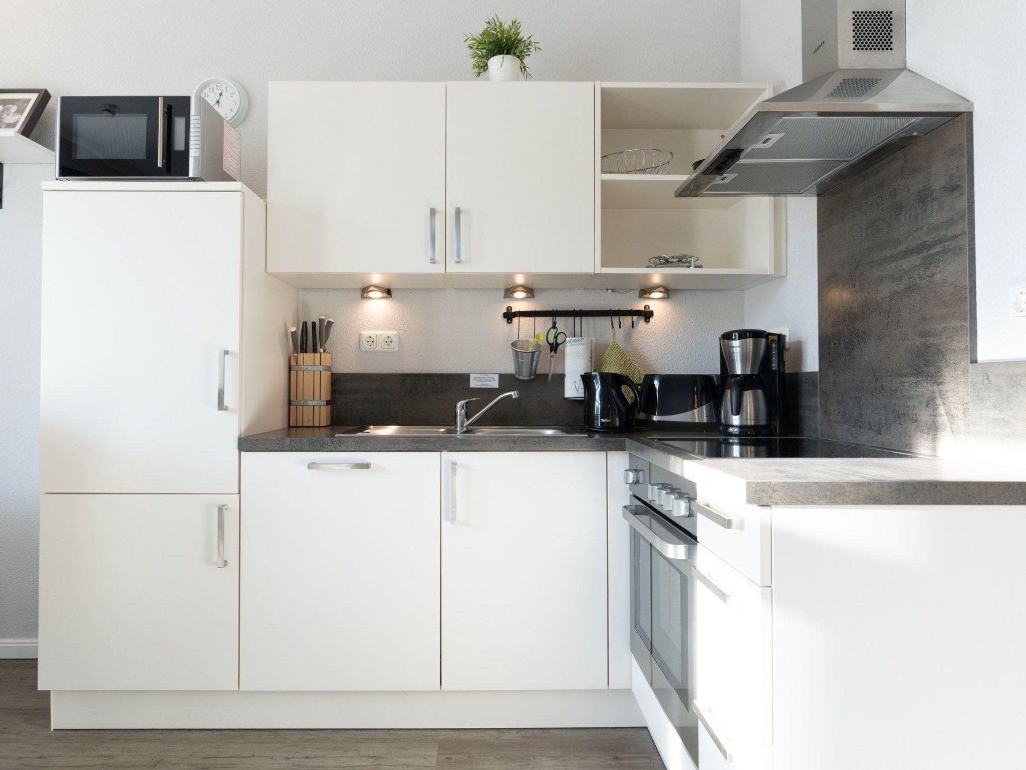 Die hier angrenzende Küchenzeile ist mit einem Kühlschrank mit Gefrierfach, einem Geschirrspüler und einem Backofen mit Cerankochfeld ausgestattet. Eine Kaffeemaschine, ein Toaster und ein Wasserkocher stehen Ihnen hier selbstverständlich zur Verfügung.