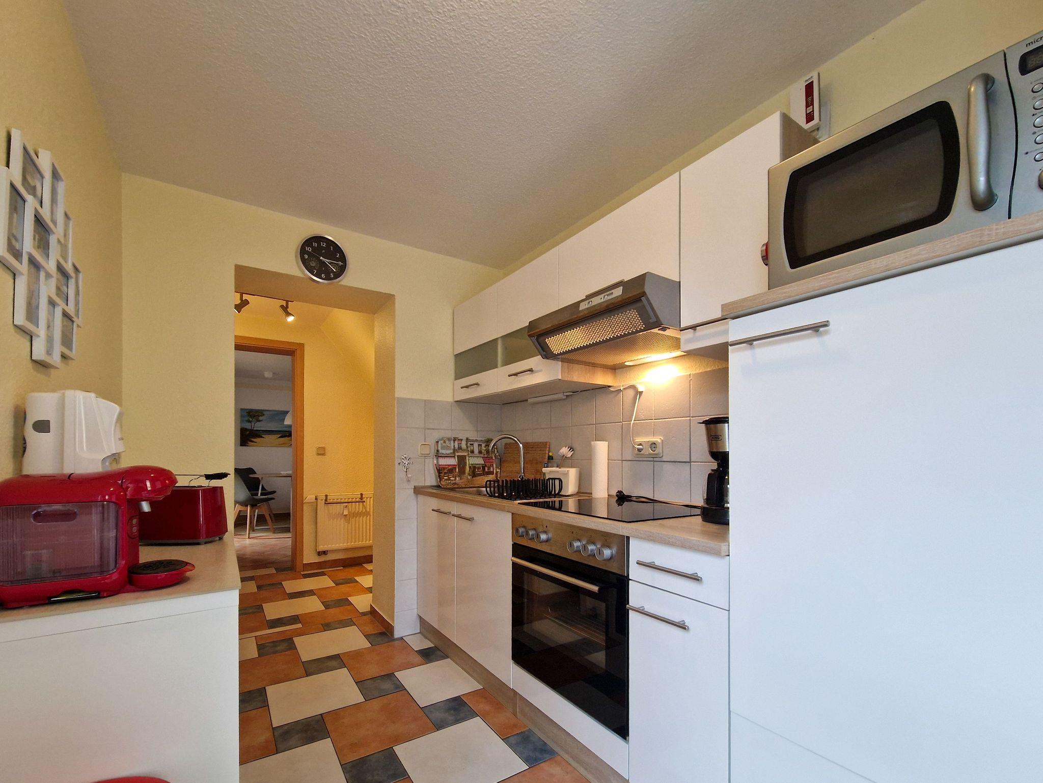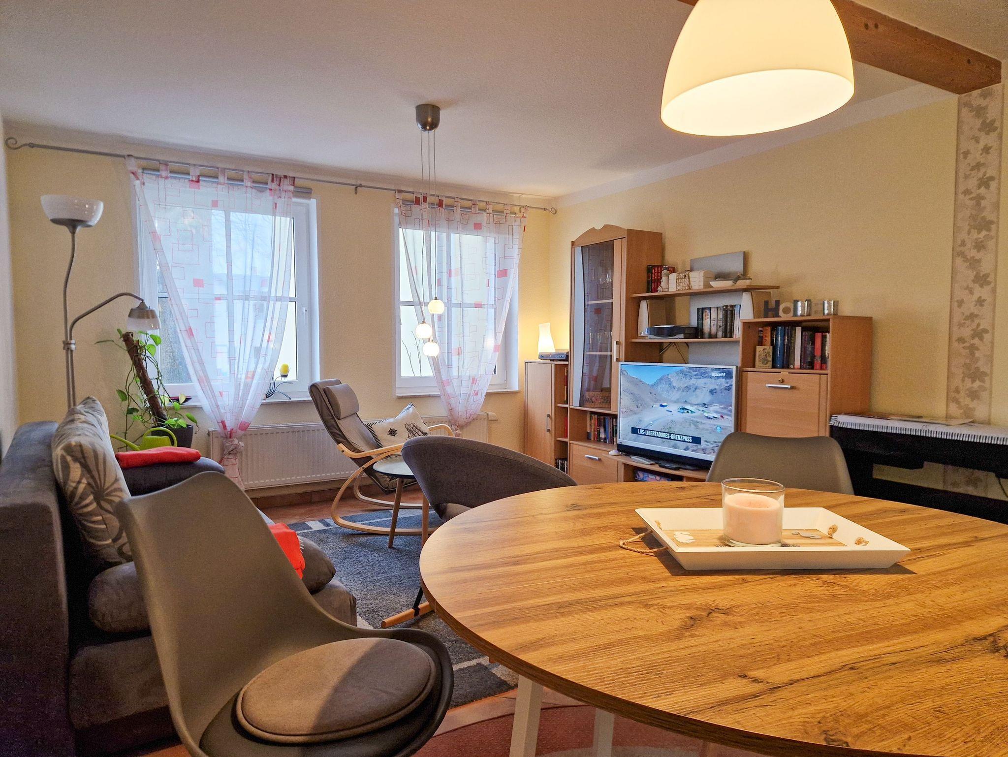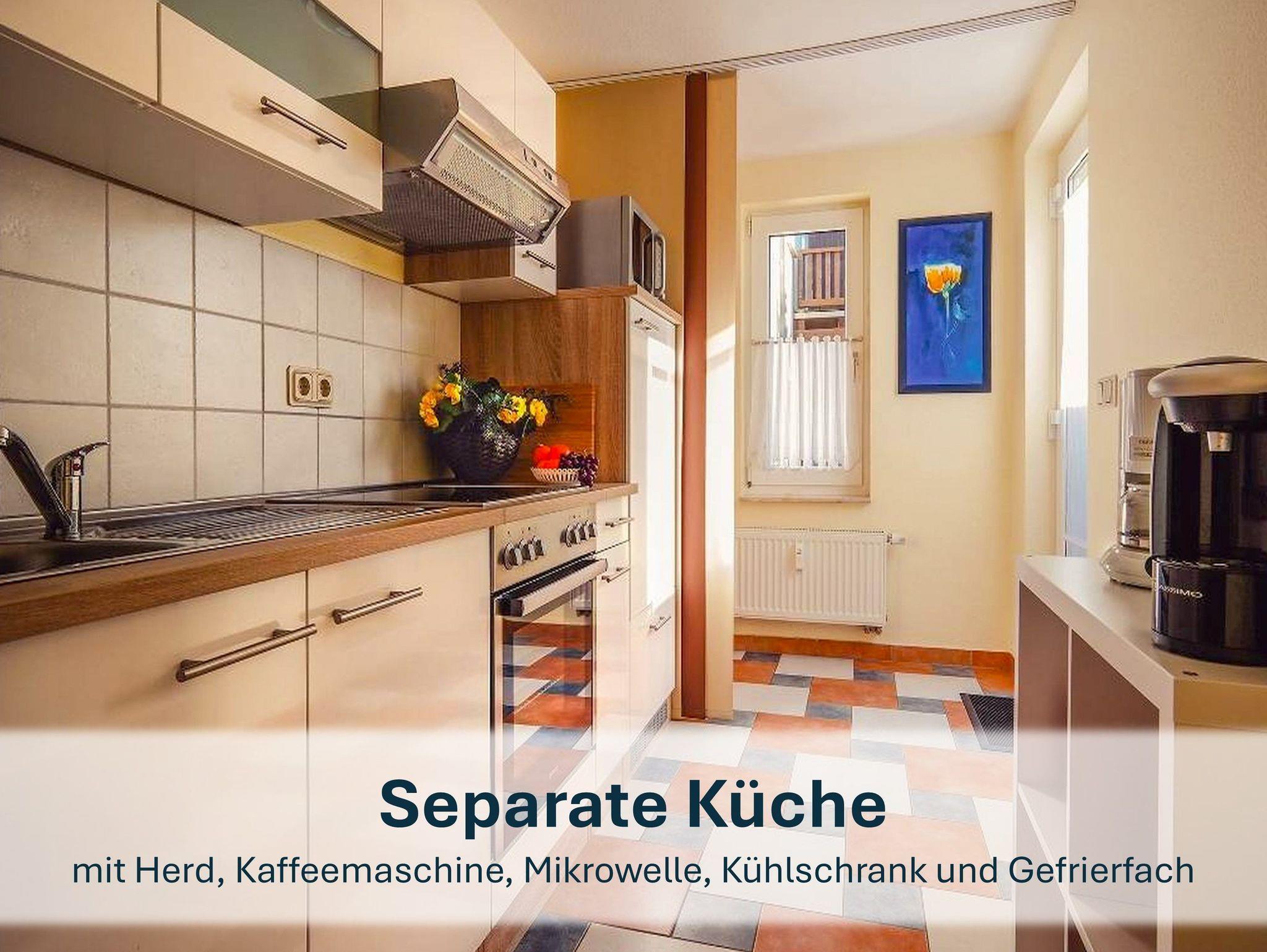 Der großzügige Wohnbereich heißt Sie mit einer gemütlichen Couch willkommen, die bei Bedarf auch in ein komfortables Schlafsofa umgewandelt werden kann. Zudem erwarten Sie ein Flat-TV, eine kleine Bibliothek, ein runder Esstisch für vier Personen und das besondere Highlight - ein Klavier. Die separate, vollständig ausgestattete Küche lässt keine Wünsche offen und bietet alles, was Sie benötigen, um Ihre Lieblingsgerichte zuzubereiten.