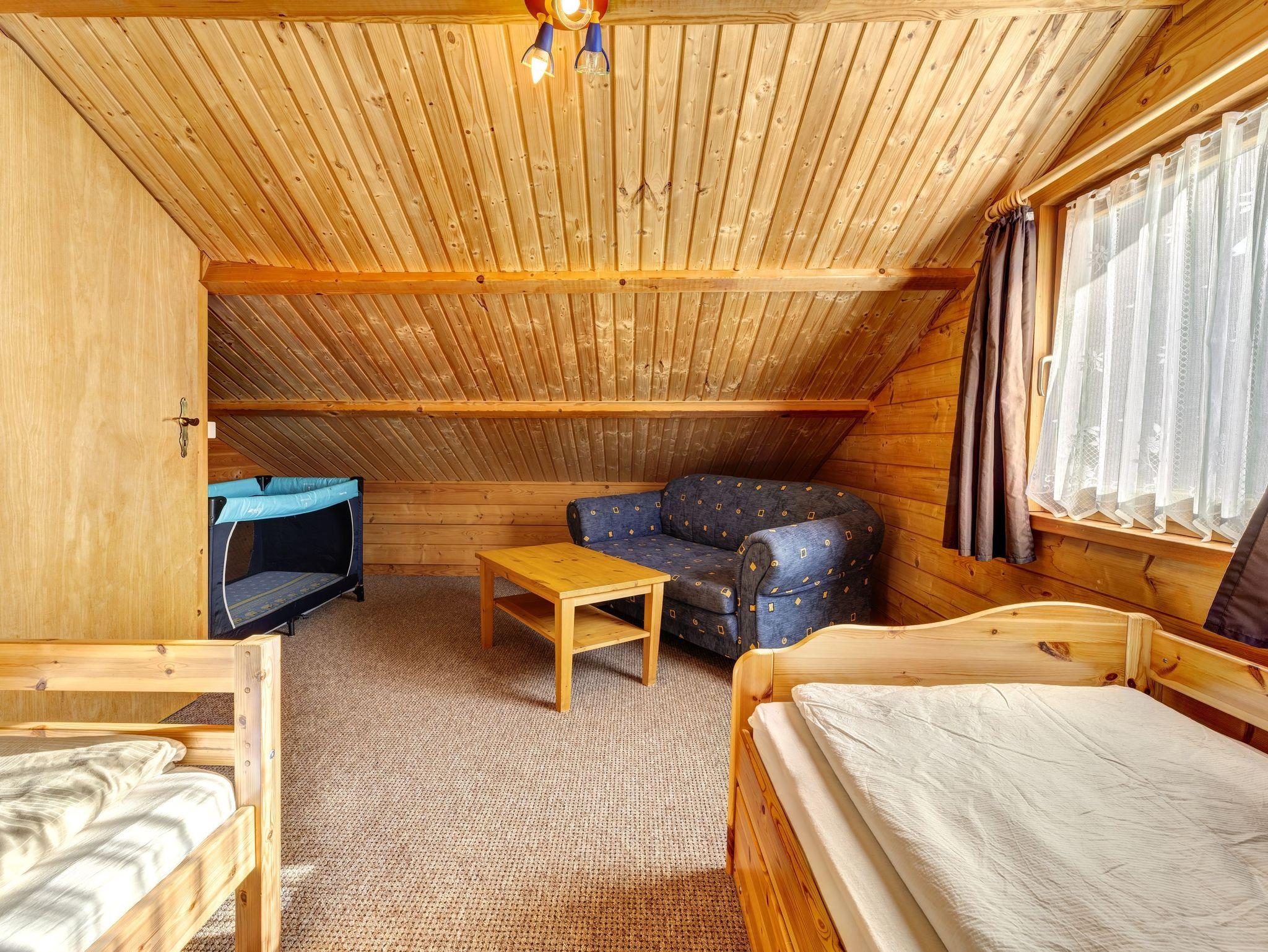 Das Haus verfügt über vier Zimmer: ein gemütliches Wohnzimmer mit offener, gut ausgestatteter Küche, ein Schlafzimmer mit Doppelbett im Erdgeschoss sowie zwei weitere Schlafzimmer im Obergeschoss ? eines mit Doppelbett, das andere mit zwei Einzelbetten und zusätzlicher Rollliege. Für Kleinkinder stehen bis zu zwei Reisebetten und ein Hochstuhl kostenfrei bereit.