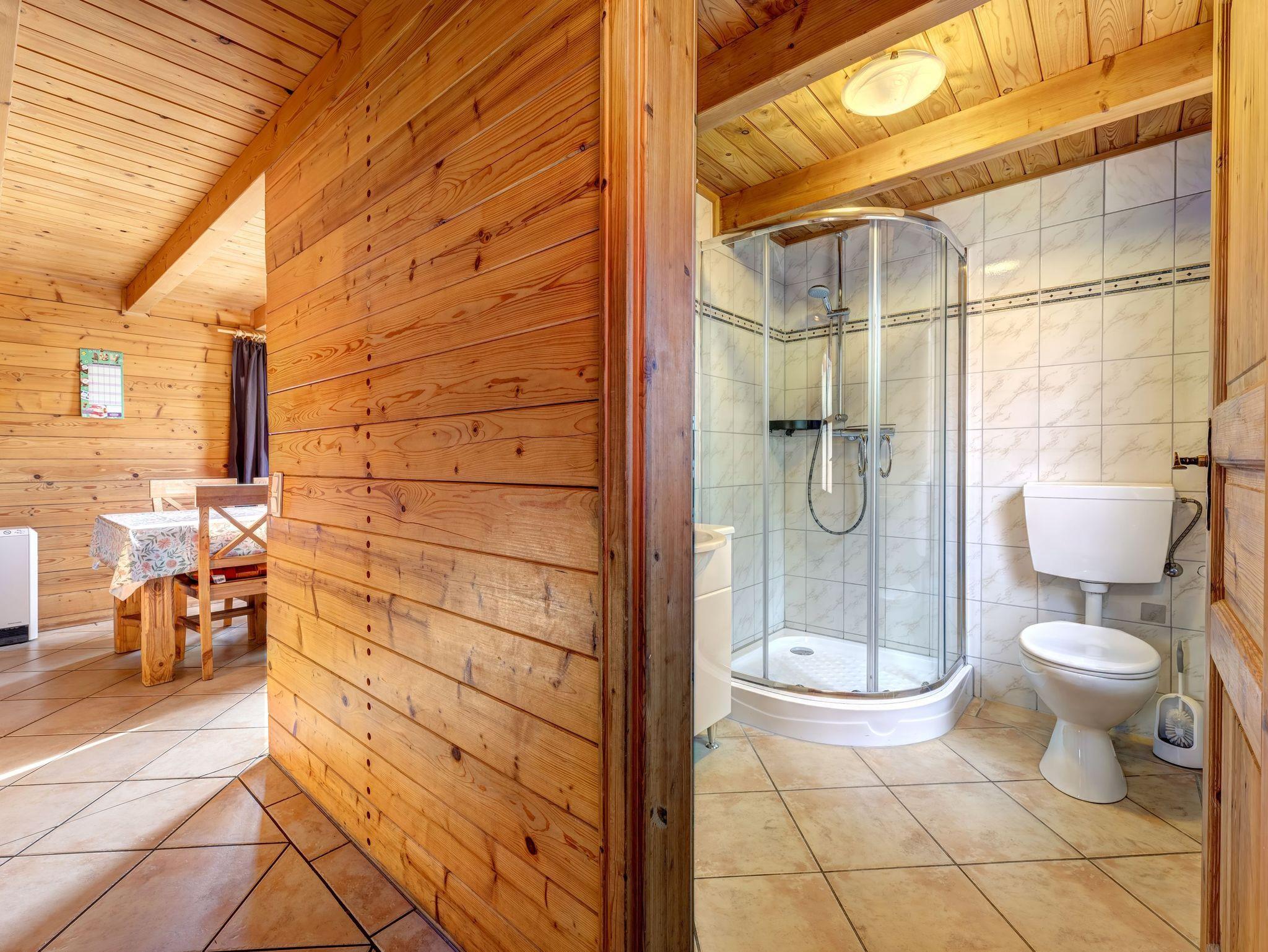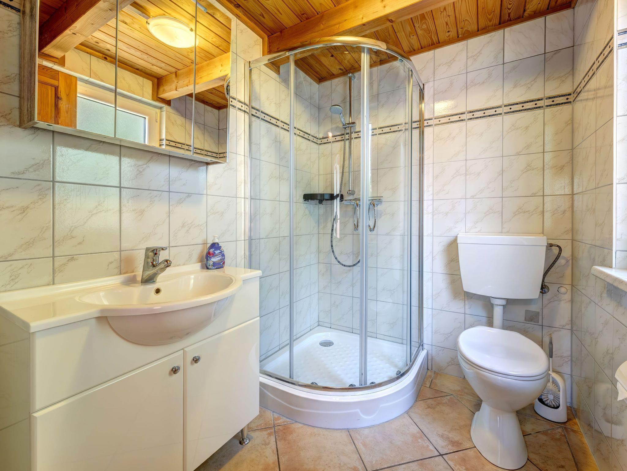 Das Badezimmer verfügt über eine Dusche, ein WC und ein Waschbecken.