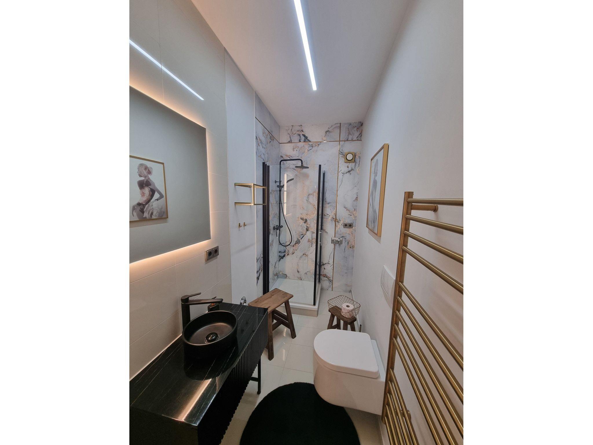 Das Badezimmer ist in einer edlen Mamoroptik und Dusche ausgestattet. Im Außenbereich befindet sich eine Sitzecke mit Pavillon.