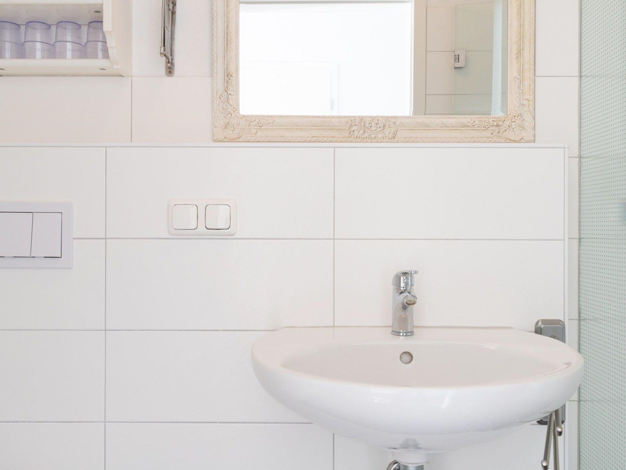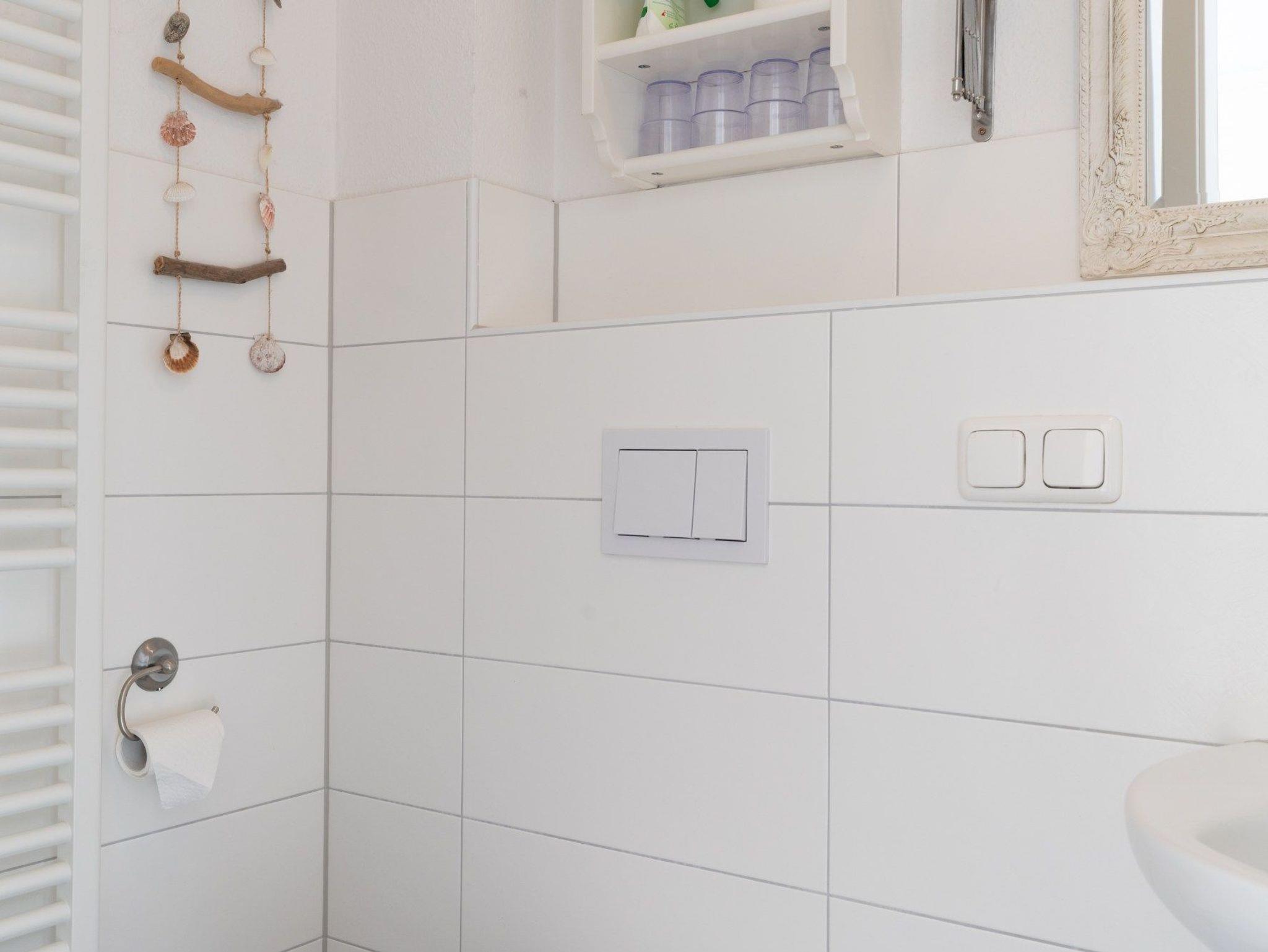 Das Badezimmer verfügt über eine Dusche (mit Absatz) und WC.