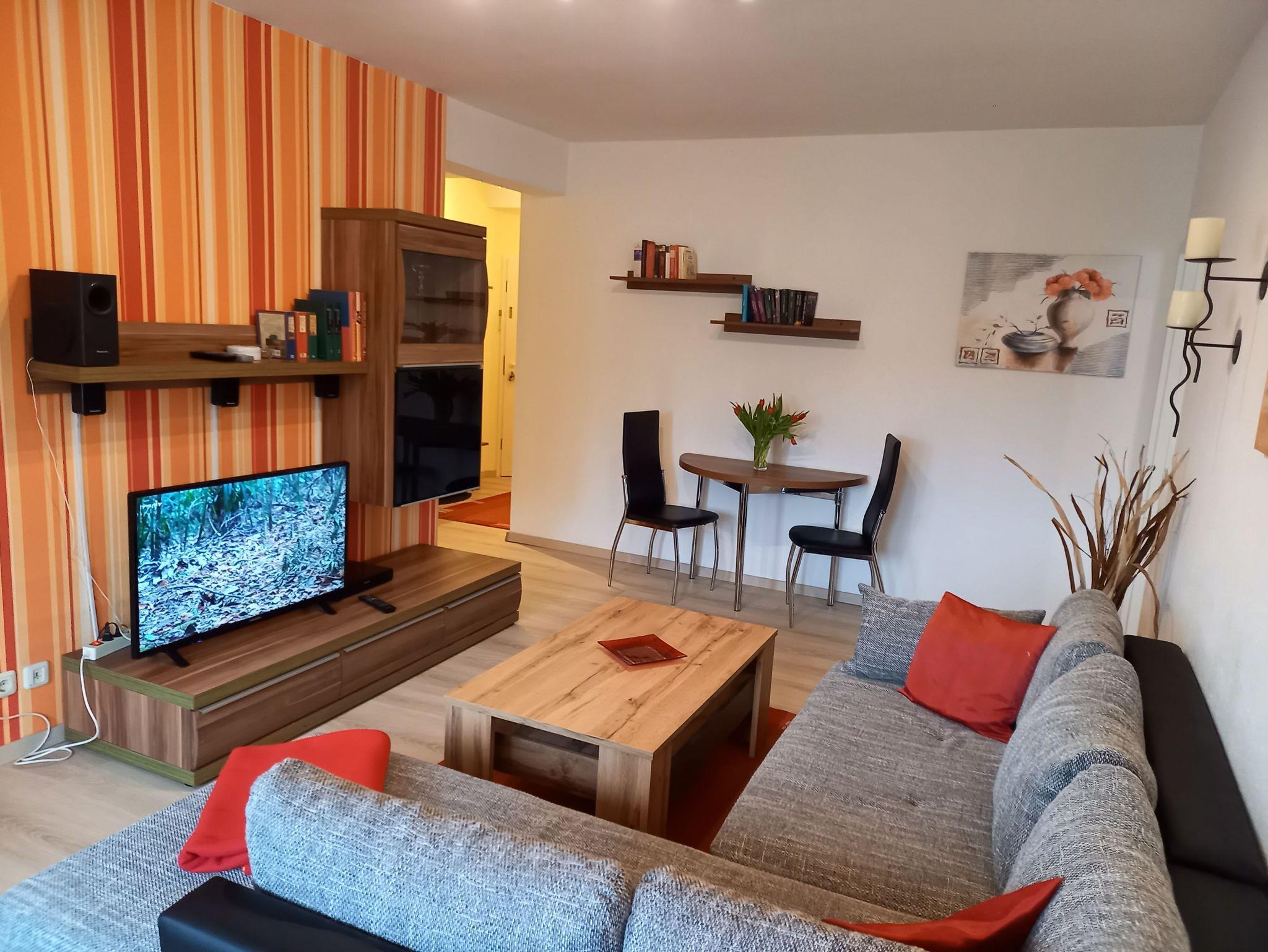 Wohnzimmer mit Essecke, Flachbildschirmfernseher/Kabelanschluß, HiFi mit DVD, Schlafsofa