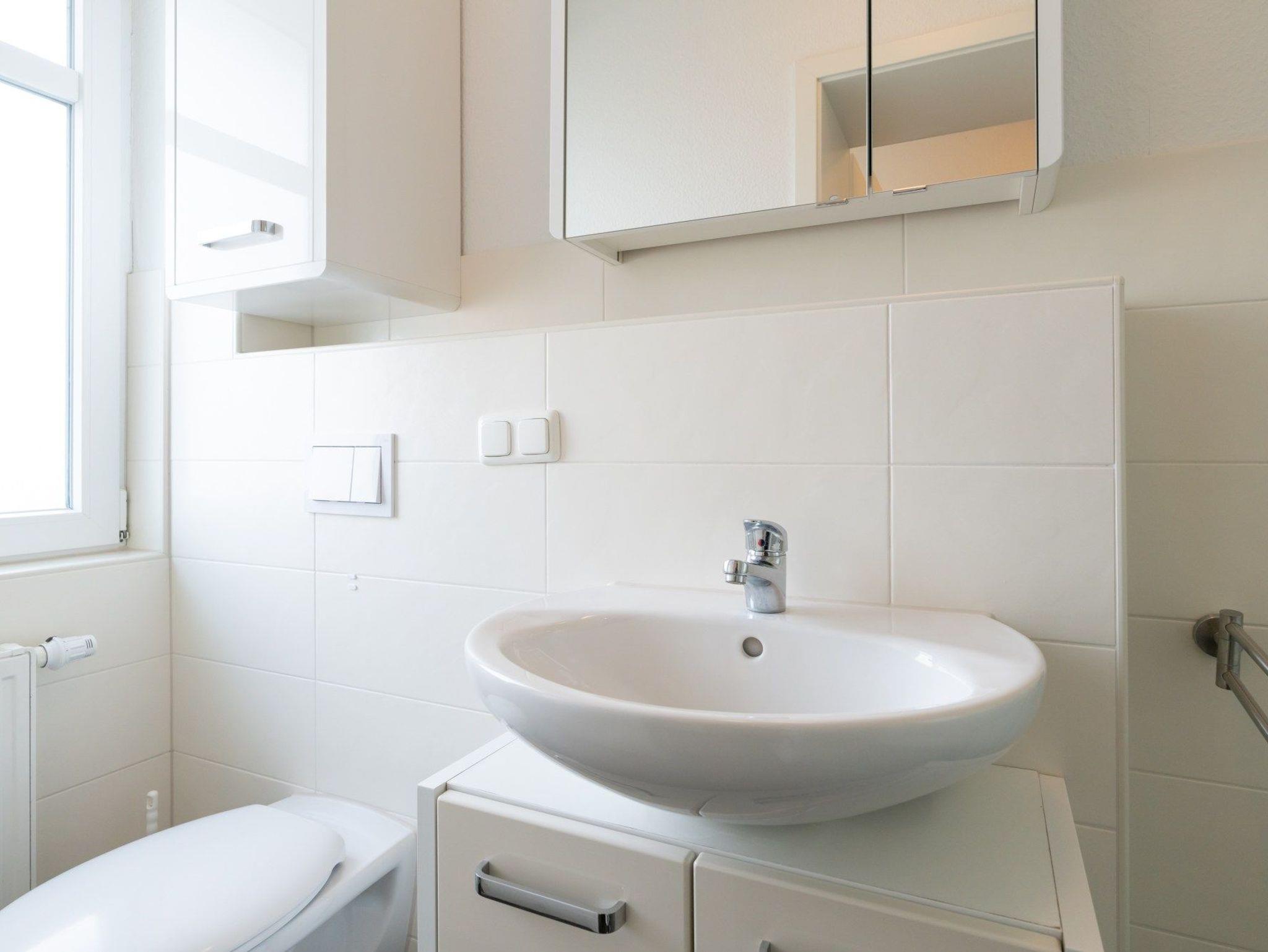 Das Badezimmer verfügt über eine Dusche (ebenerdig) und WC.