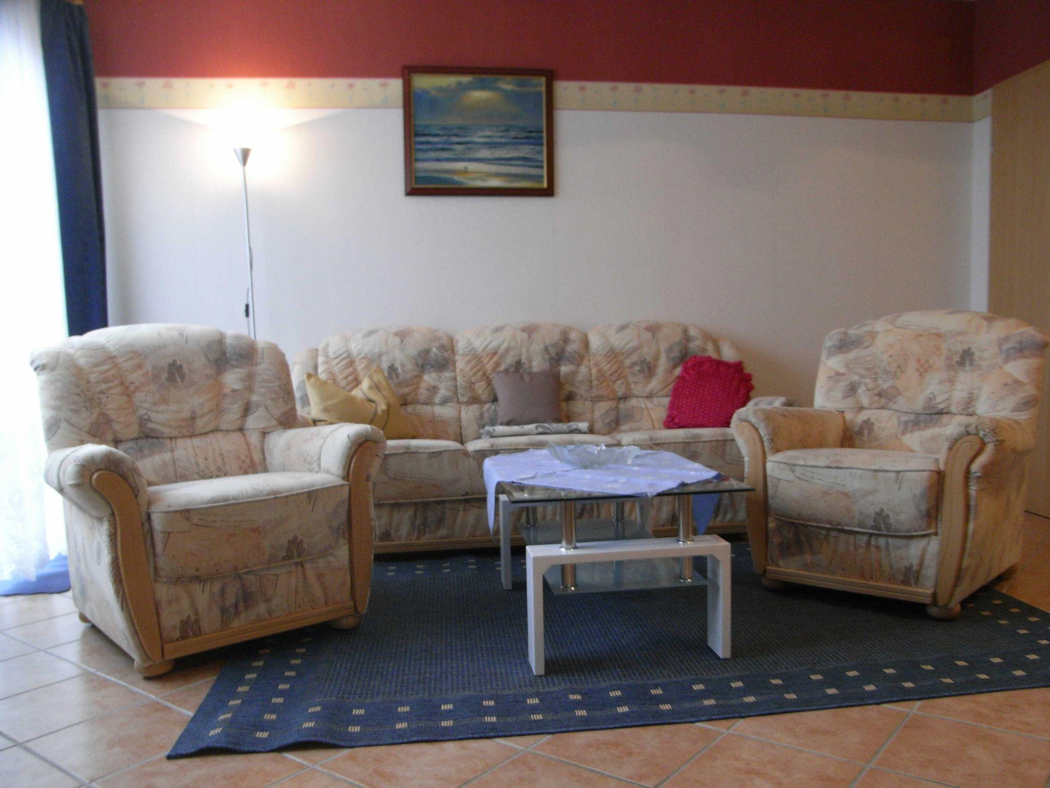Die komplett eingerichtete Ferienwohnung mit Wohnzimmer, zwei Schlafzimmern mit einmal einem Doppelbett und einmal zwei Einzelbetten, Küchenzeile, Dusche, WC, Flur und großer Terrasse/Balkon würde für Sie bereitstehen. Zur Ausstattung gehören weiter Radio, Sat- Fernseher, einmalig Bettwäsche und Handtücher. In der Küchenzeile sind Mikrowelle, Kaffeemaschine und Toaster, Eier- und Wasserkocher sowie ein 2- Platten-Kocher, Kühlschrank und Geschirr vorhanden.
