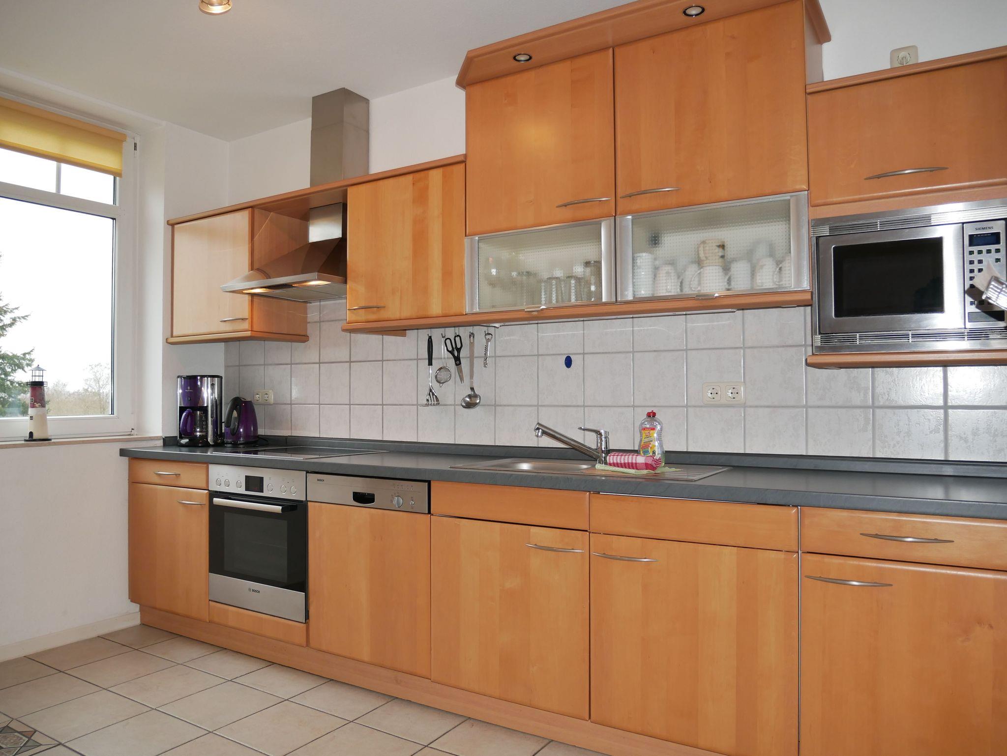Wohn- und Esszimmer mit Sofa inkl. Schlaffunktion, 2 Sesseln, Couchtisch, Radio, Kabel TV LCD, großem Esstisch und vier Stühlen. Küchenzeile mit Geschirrspüler, Elektroherd, Dunstabzugshaube, Kühlschrank mit Gefrierfach, Mikrowelle, Toaster, Kaffeemaschine Wasserkocher und ausreichend Geschirr. Weiterhin Bügeleisen, Bügelbrett, Wäscheständer und Staubsauger.