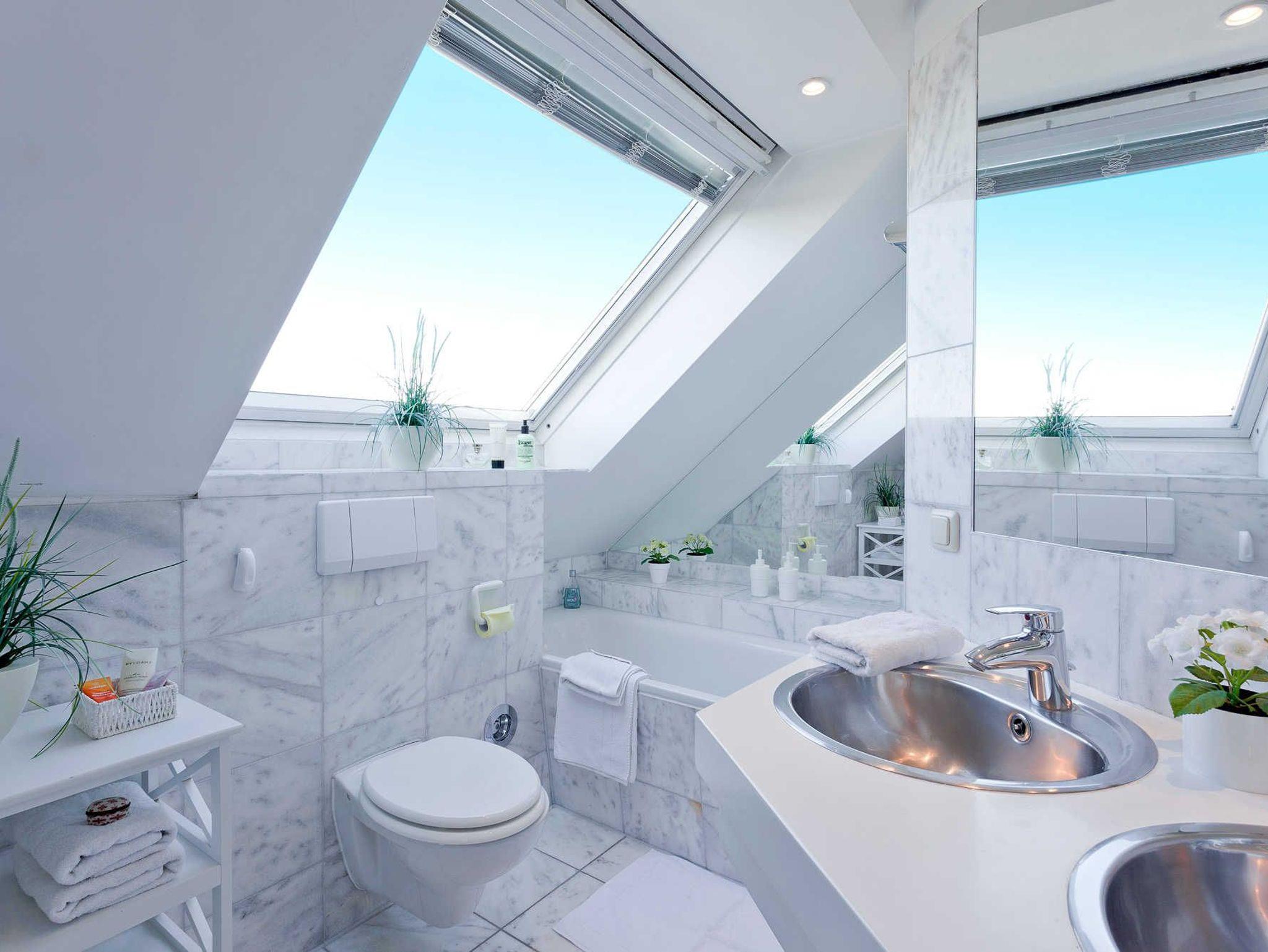Bad in Marmor mit Dusche/Wanne, Doppelwaschtisch, WC