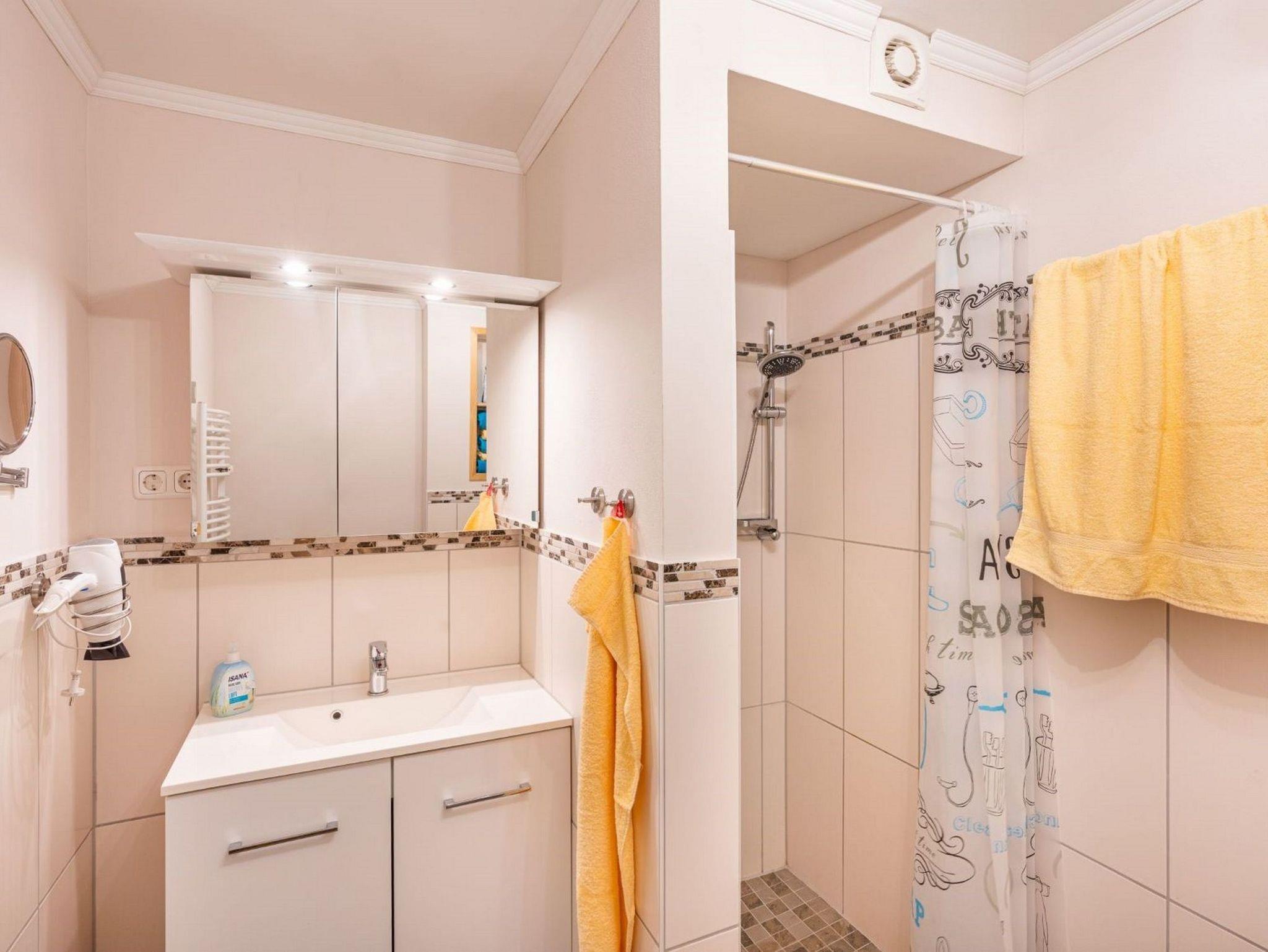 Das freundliche Schlafzimmer mit FlatTV lockt für die Nachtruhe, aber auch für ein Schlummerstündchen am Nachmittag, mit einem bequemen Doppelbett (160 x 200cm / zwei getrennte Matratzen). Damit Sie Ihre wohlverdiente Urlaubszeit bereits am Anreisetag in vollen Zügen genießen können? haben wir das Bett für Sie und das für Ihre lieben Mitreisenden bereits bezogen und ein Duschtuch sowie ein kleines Handtuch bereitgelegt. Das Badezimmer - welches vom Schlafzimmer abgeht - ist mit Dusche, WC und einem Haartrockner ausgestattet.
