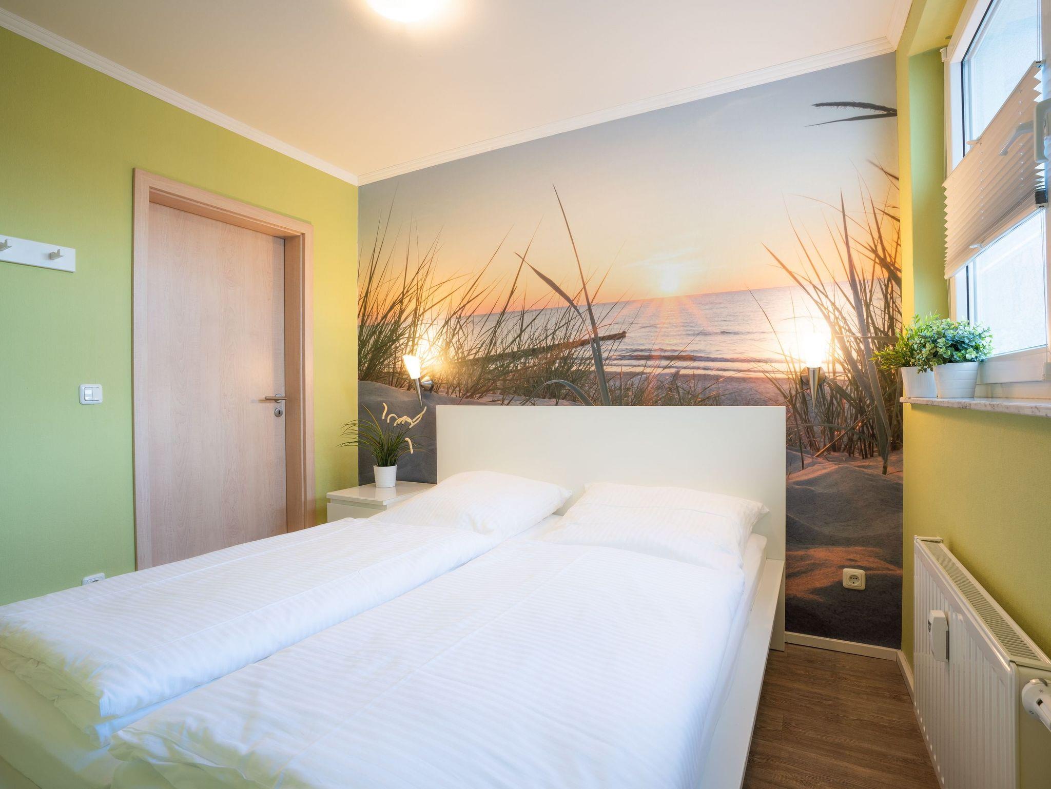 Das freundliche Schlafzimmer mit FlatTV lockt für die Nachtruhe, aber auch für ein Schlummerstündchen am Nachmittag, mit einem bequemen Doppelbett (160 x 200cm / zwei getrennte Matratzen). Damit Sie Ihre wohlverdiente Urlaubszeit bereits am Anreisetag in vollen Zügen genießen können haben wir das Bett für Sie und das für Ihre lieben Mitreisenden bereits bezogen und ein Duschtuch sowie ein kleines Handtuch bereitgelegt. Das Badezimmer - welches vom Schlafzimmer abgeht - ist mit Dusche, WC und einem Haartrockner ausgestattet.