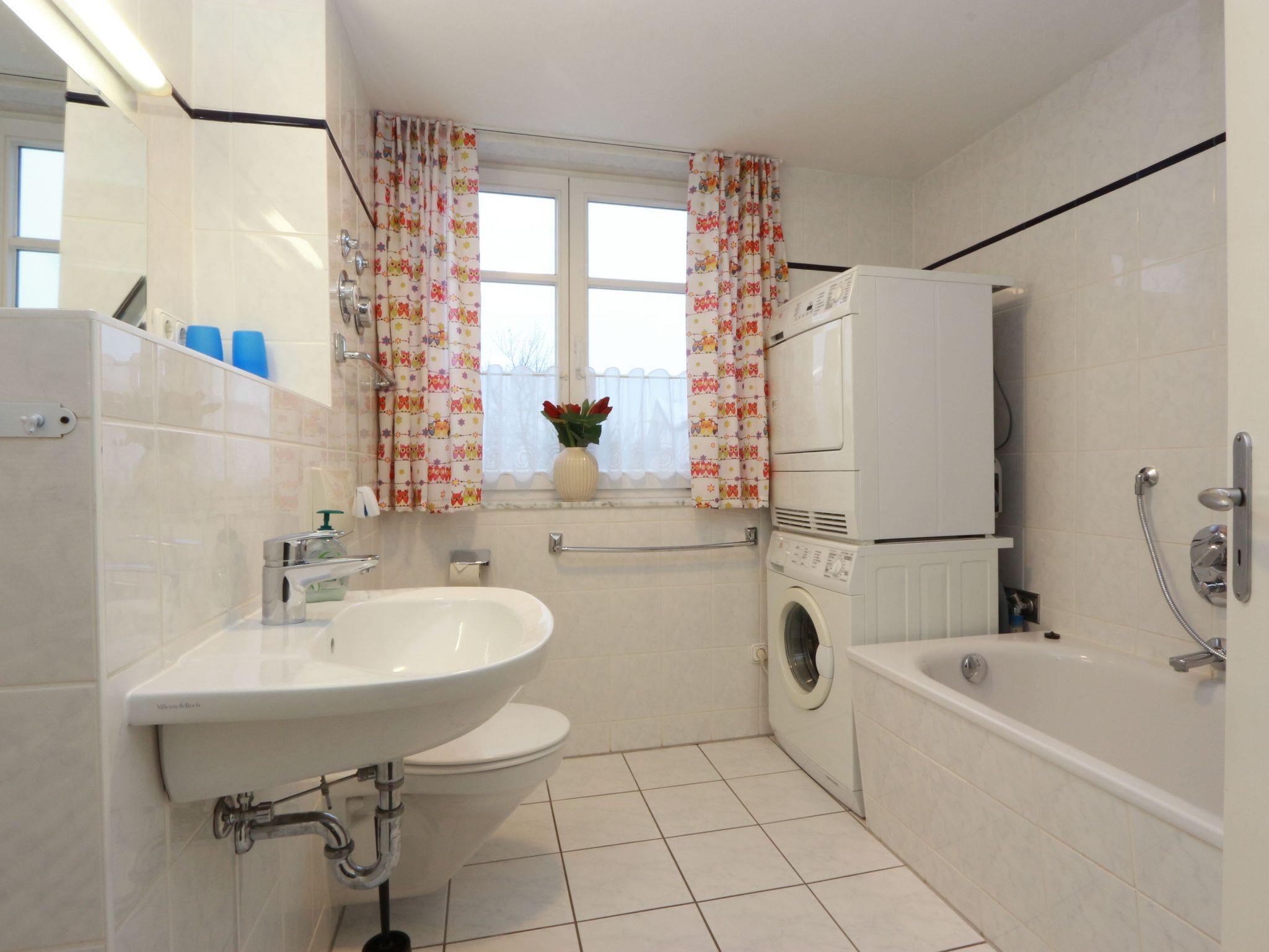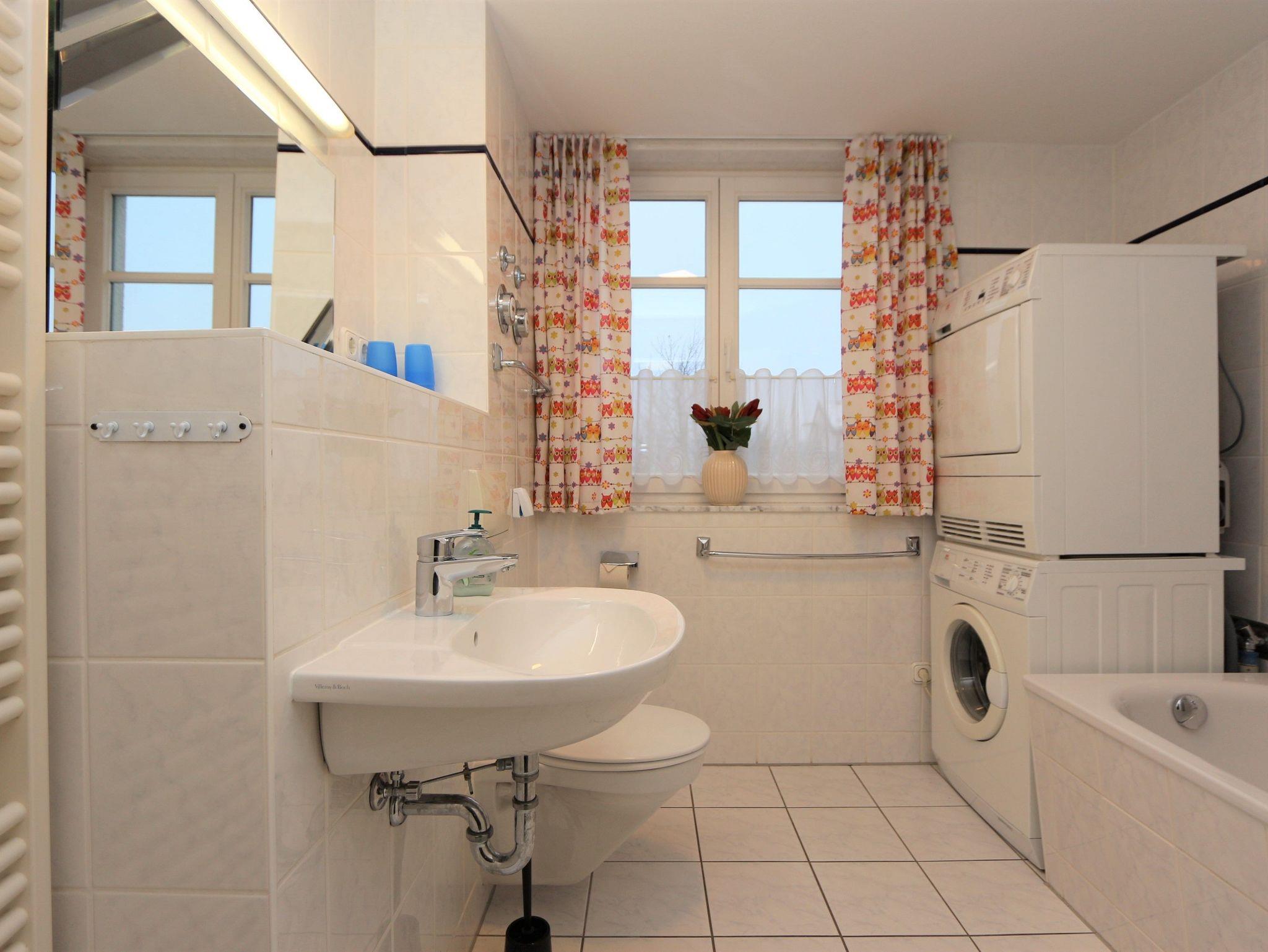 • Bad mit WC, Badewanne, Handtuchtrockenheizkörper, Waschmaschine und Wäschetrockner.