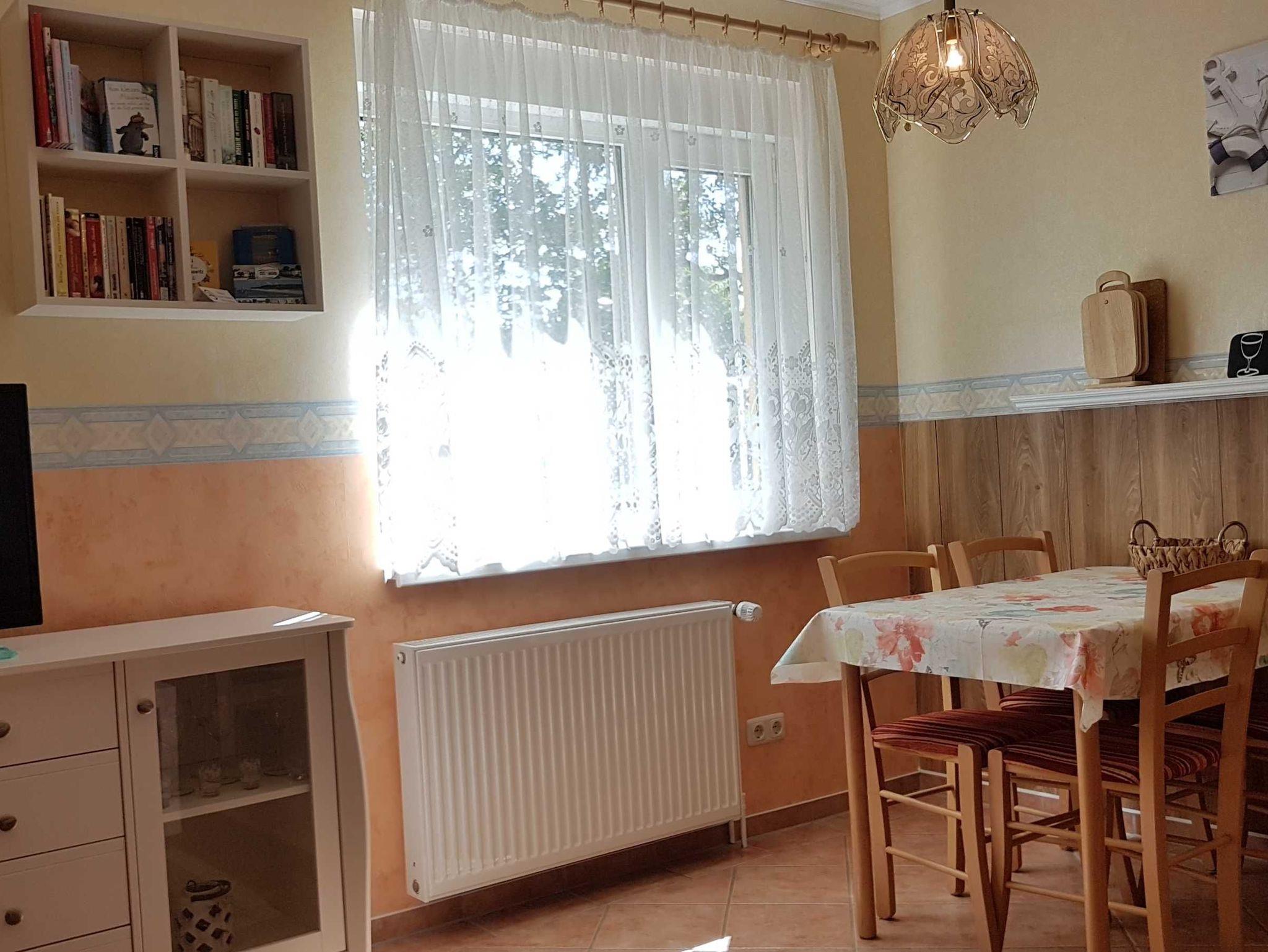 Die komplett eingerichtete Ferienwohnung mit Wohnzimmer, zwei Schlafzimmern mit einmal einem Doppelbett und einmal zwei Einzelbetten, Küchenzeile, Dusche, WC, Flur und großer Terrasse würde für Sie bereitstehen. Zur Ausstattung gehören weiter Radio, Sat- Fernseher, einmalig Bettwäsche und Handtücher. In der Küchenzeile sind Mikrowelle, Kaffeemaschine und Toaster, Eier- und Wasserkocher sowie ein 2- Platten-Kocher, Kühlschrank und Geschirr vorhanden.