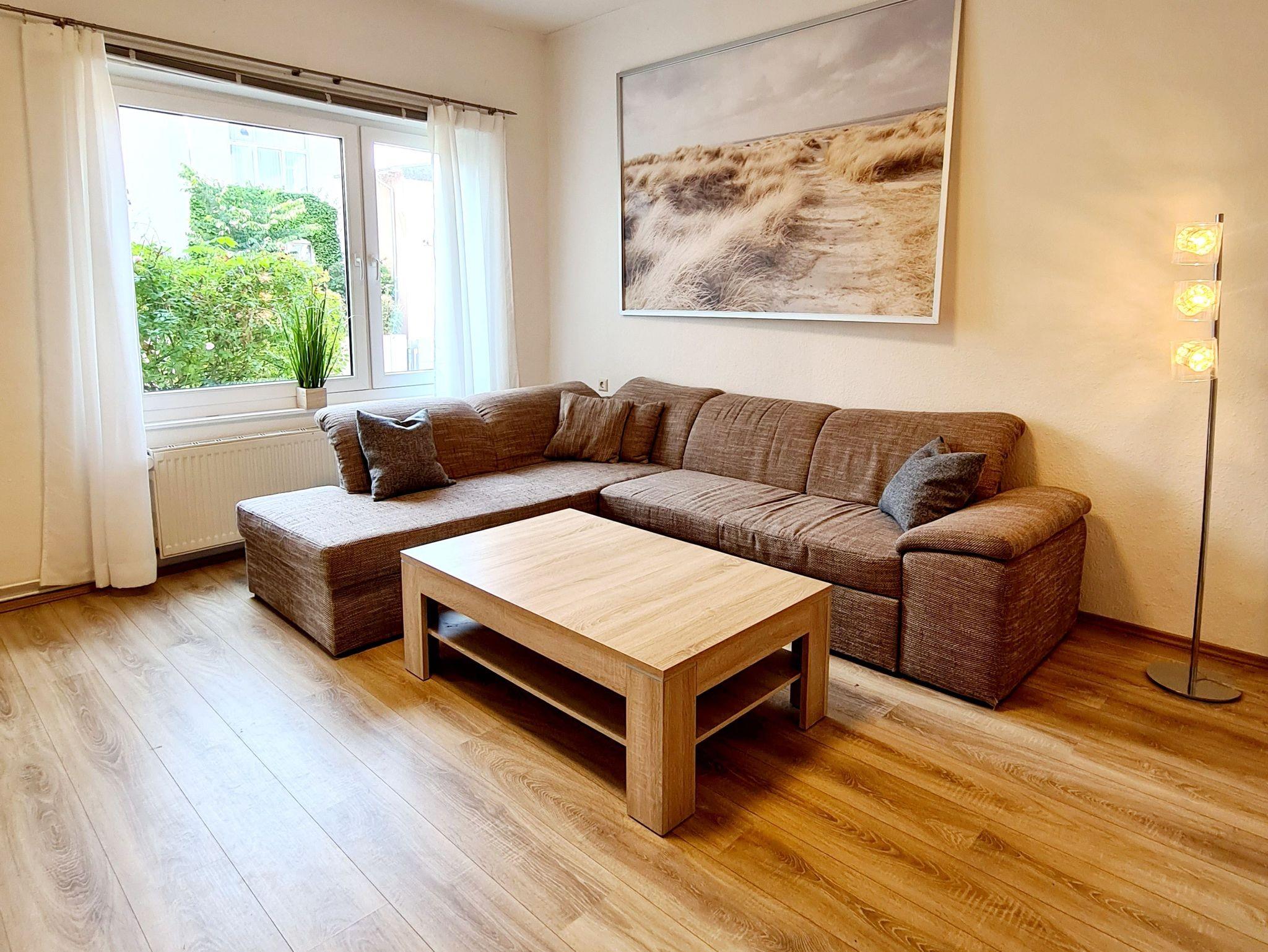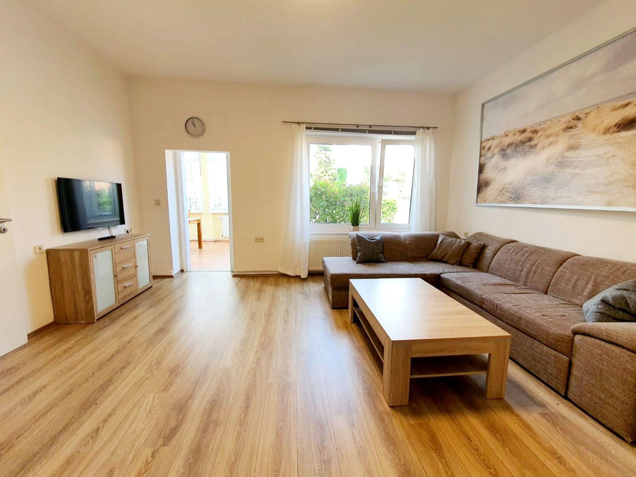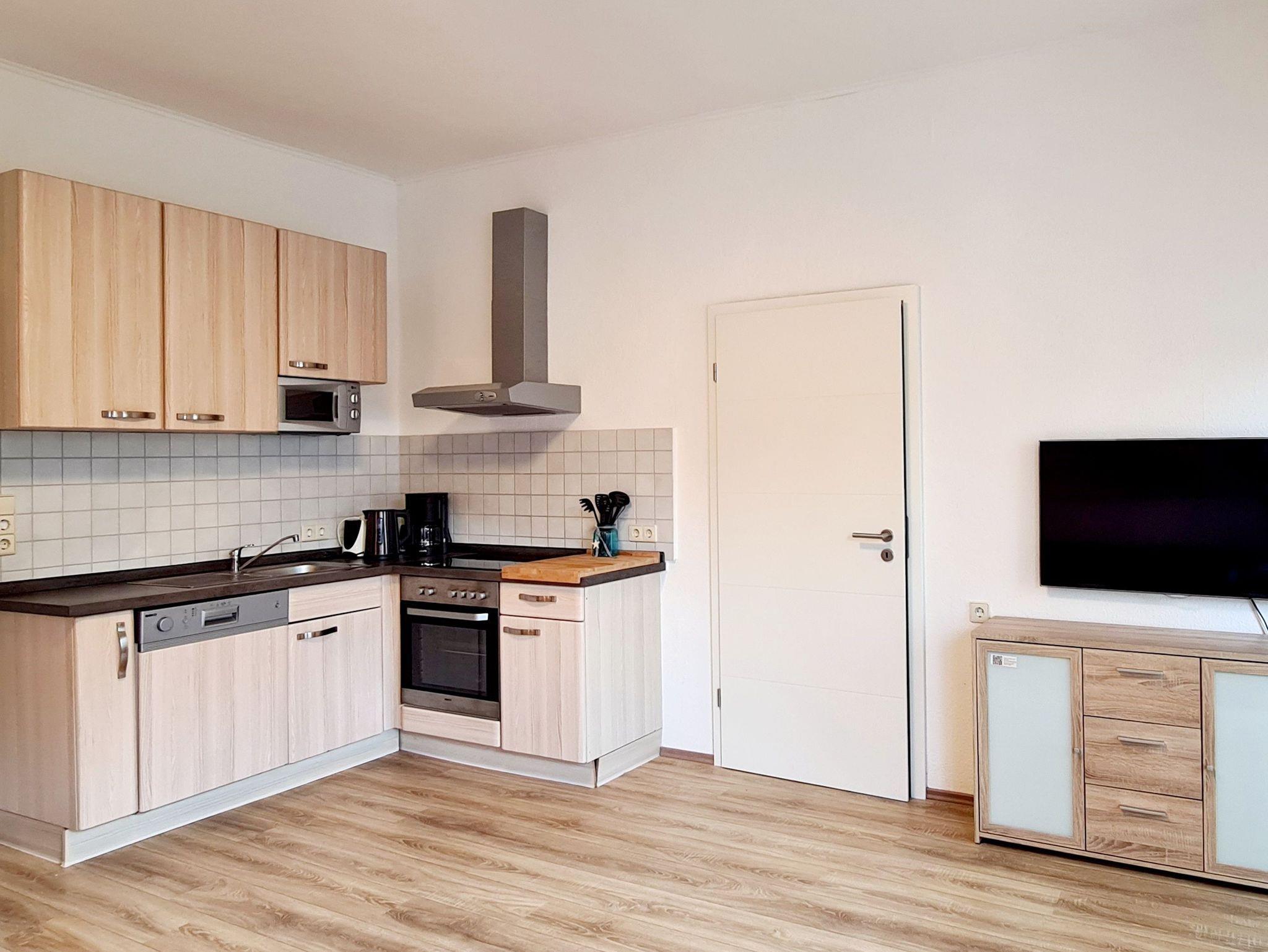 Das Wohnzimmer verfügt über eine Couch mit Schlaffunktion und ist ausgestattet mit einer offenen Einbauküche mit Herd (Ceranfeld, Backofen und Dunstabzugshaube), Kaffeemaschine, Wasserkocher, Kühlschrank ohne Gefrierfach und Geschirrspüler.