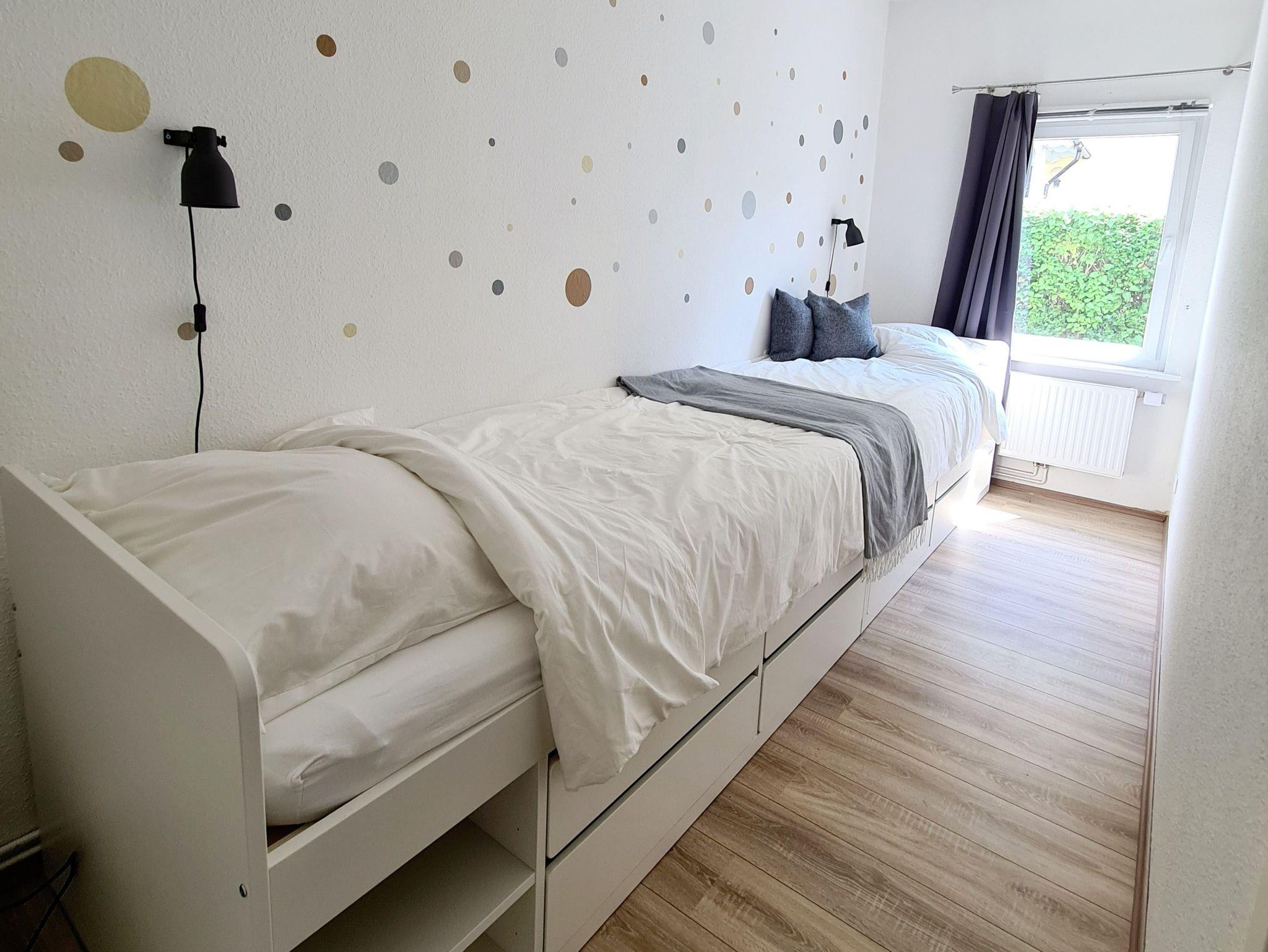 Ein Schlafzimmer ist mit einem Doppelbett (180×200) ausgestattet und ein Schlafzimmer mit 2 Einzelbetten,