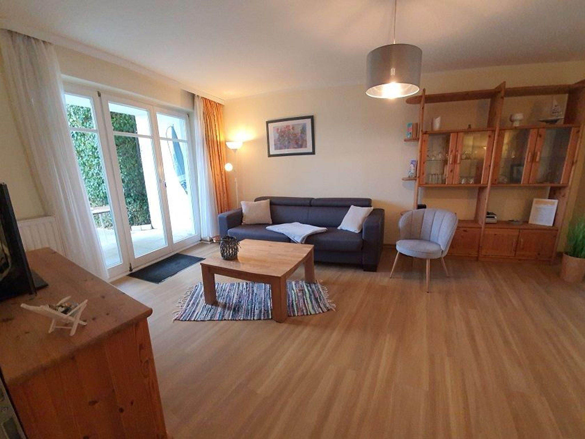 Die Parterre-Wohnung hat eine Terrasse die nach Süden ausgerichtet ist; mit 4 Terrassenstühlen, Tisch und Sonnenschirm.