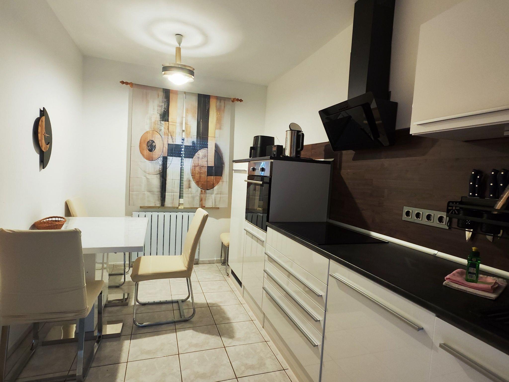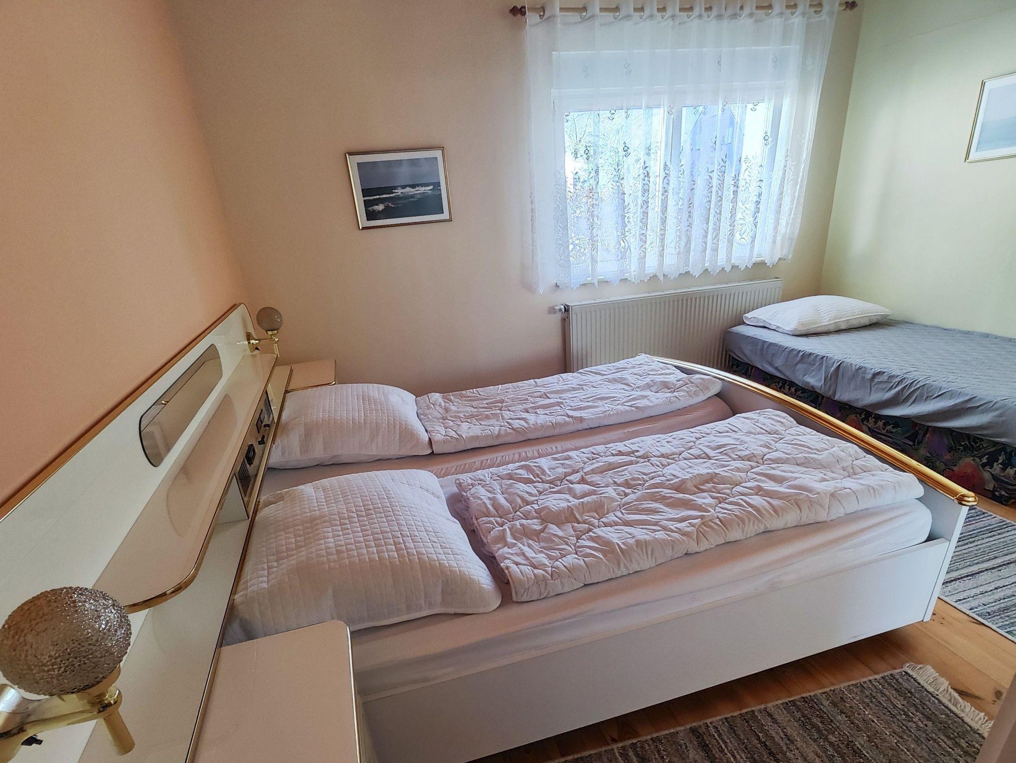 Das Schlafzimmer ist mit einem Doppelbett und einer zusätzlichen Liege ausgestattet. Im Wohnbereich befinden sich eine gemütliche ausziehbare Couch sowie eine weitere Schlafliege. Zudem verfügt die Wohnung über eine separate Küche, ein Badezimmer mit Duschkabine und einen Eingangsflur mit Garderobe.