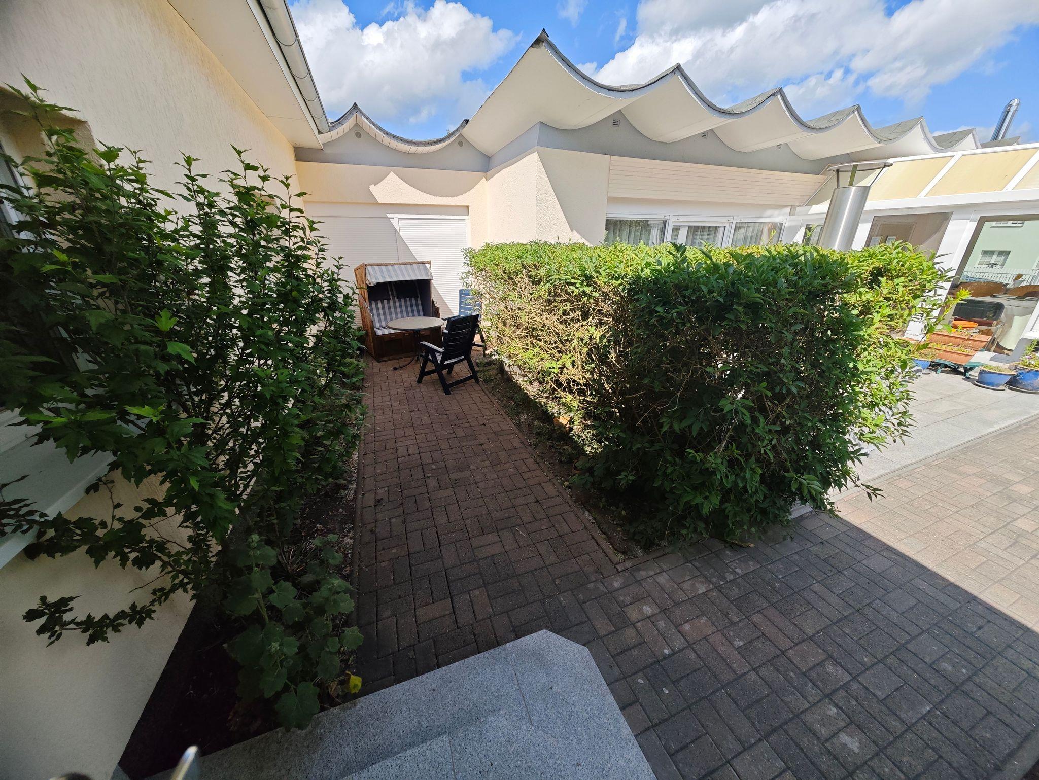 Eine möblierte Terrasse lädt zum Entspannen im Freien ein.