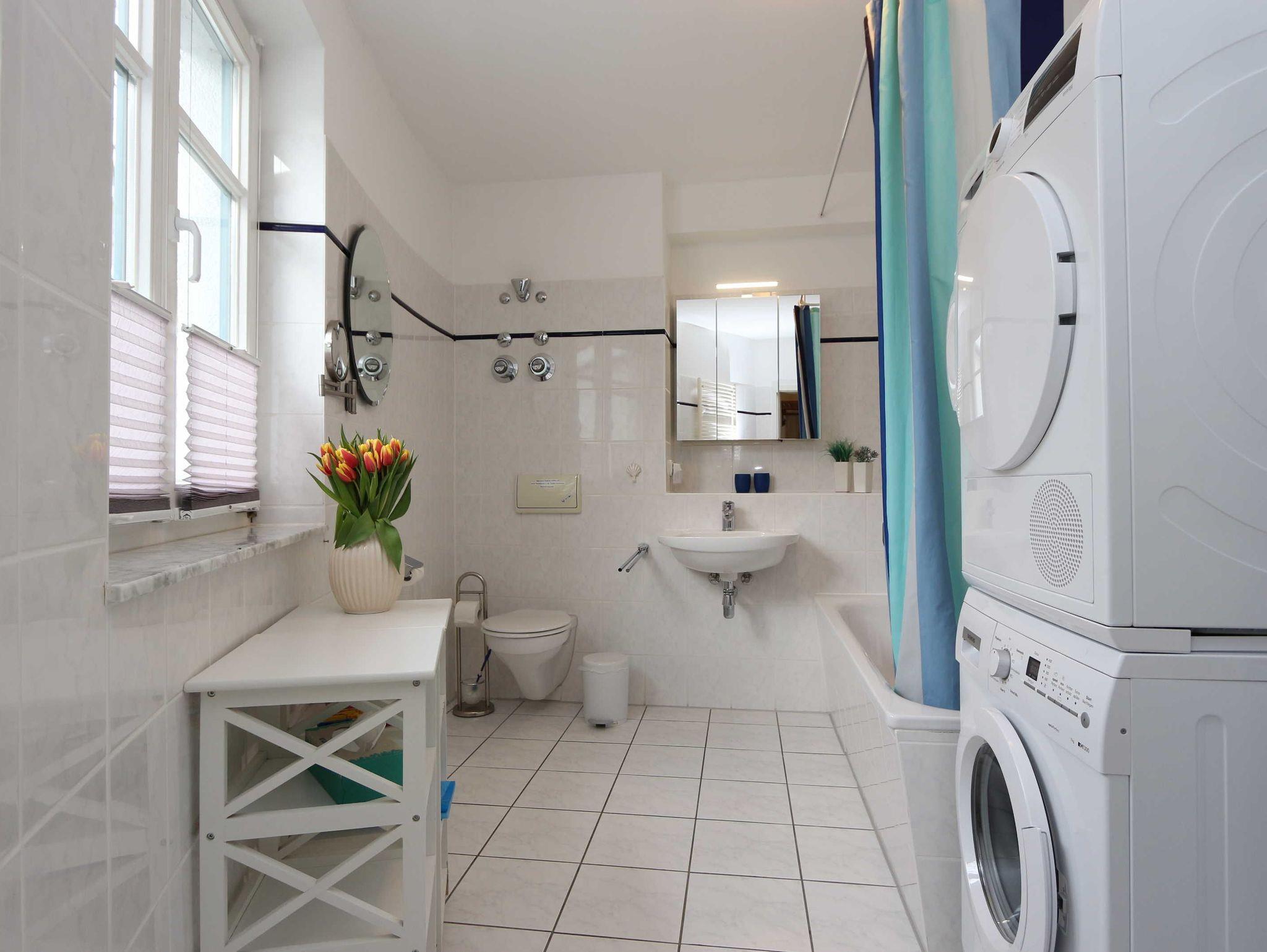 • Bad mit Badewanne, Waschmaschine, Wärmepumpen-Wäschetrockner und Handtuchtrockenheizkörper.