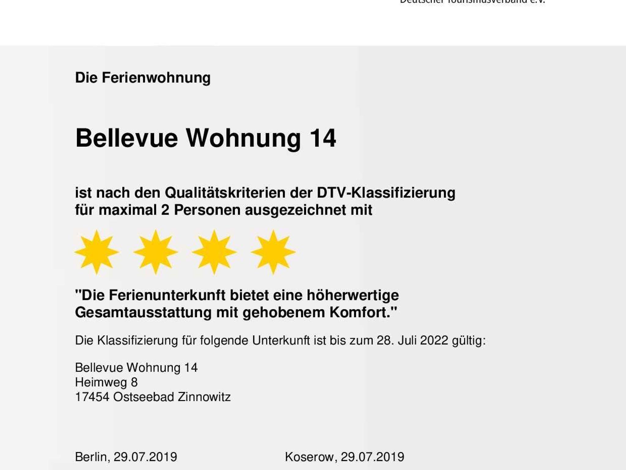 • Diese Wohnung wurde vom DTV (Deutscher Tourismusverband) mit 4-Sternen bei einer Belegung mit 2 Personen klassifiziert. Bei einer Belegung von mehr als 2 Personen ist der DTV-Sterne-Standard von 4-Sternen nicht mehr gewährleistet.