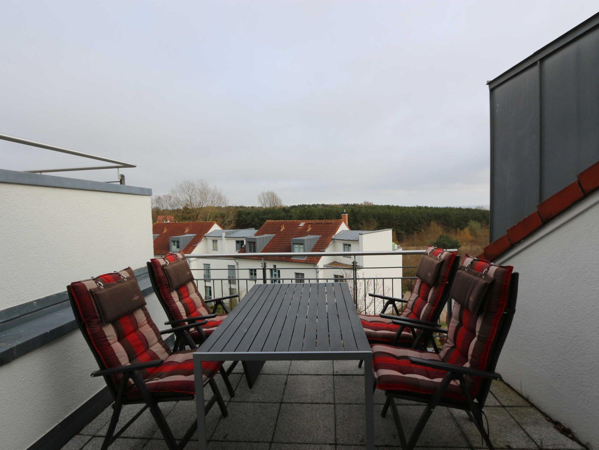 • 2 Dachterrassen nach Südwesten ausgerichtet und mit schönem Ausblick auch auf das Achterwasser mit Sonnenschirm, Tisch und 4 Stühlen incl . bequemen Auflagen