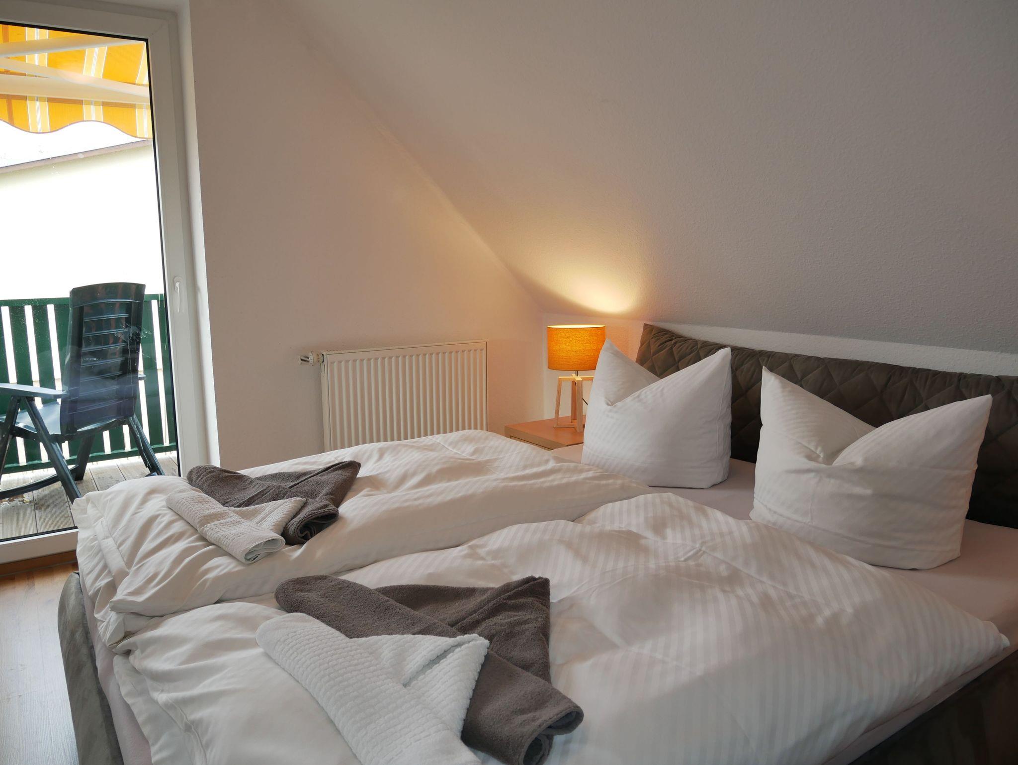 Die 40qm große gemütliche Ferienwohnung befindet sich im Obergeschoss des Gästehauses und bietet Platz für 2 Personen. Sie verfügt über ein getrenntes Schlaf- und Wohnzimmer, einen möblierten Balkon, sowie über ein eigenes Bad mit Dusche.